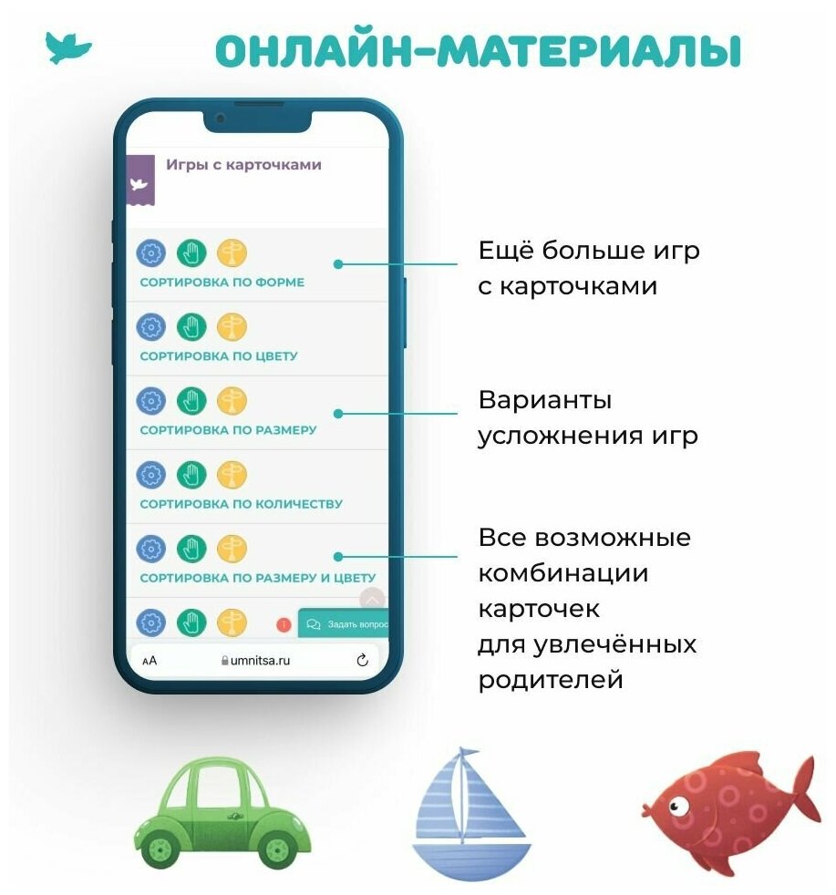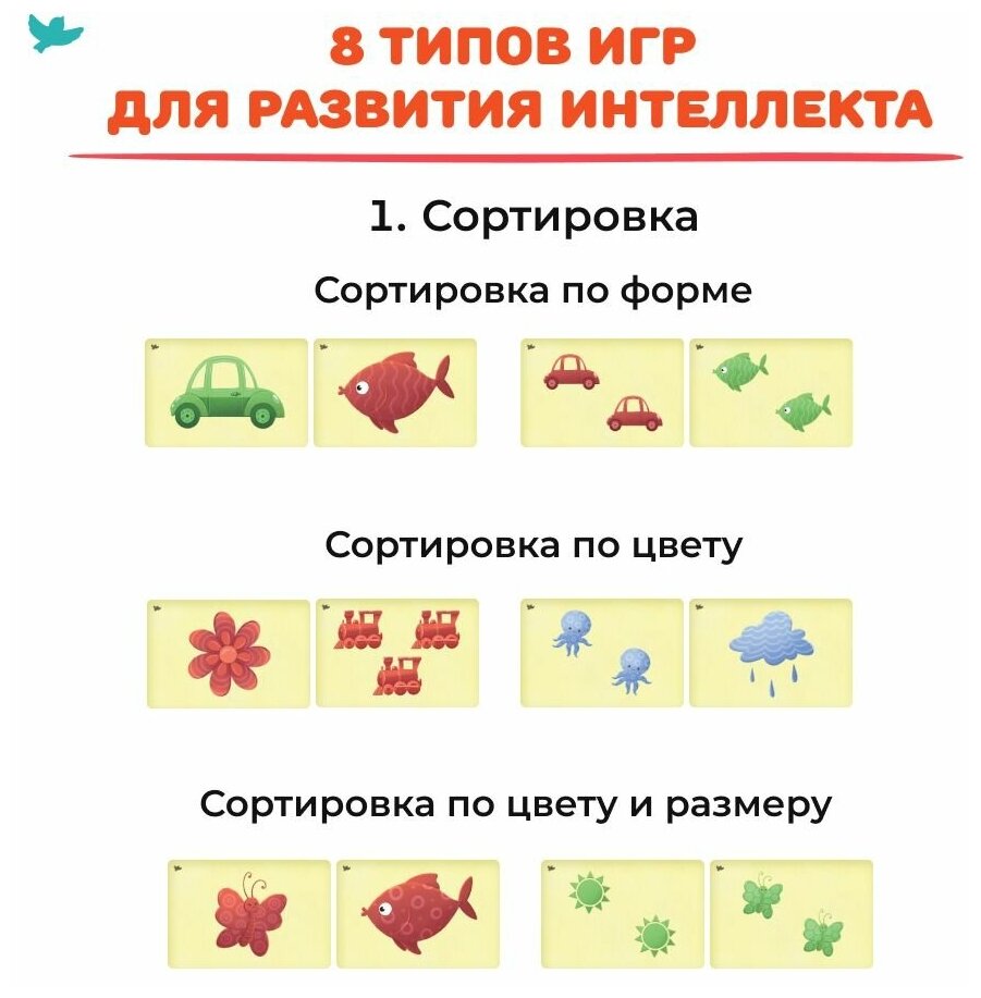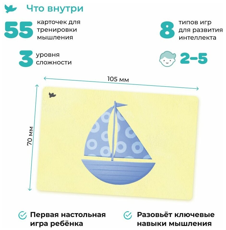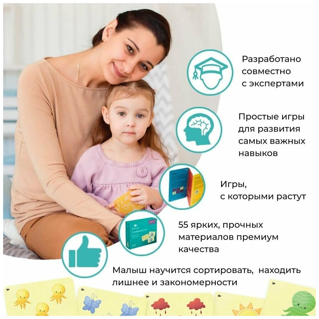 «Соображалки» – первая настольная игра ребёнка, ведь тут есть правила, условия для победы, в некоторых случаях ещё и очерёдность хода. Мы прописали множество сценариев игры с этими карточками, а также подсказываем, как можно усложнить игру для детей постарше.