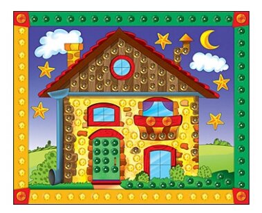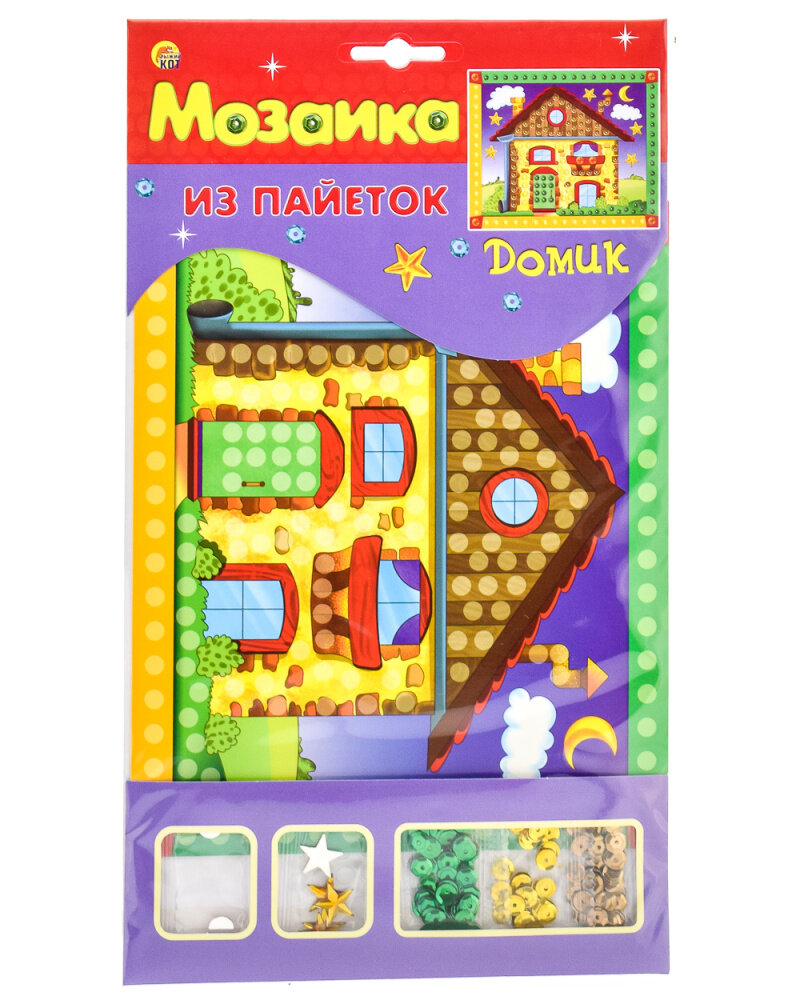 В набор входят: картонная основа с рисунком, пайетки и декоративные элементы, самоклеящиеся пластиковые кружочки.