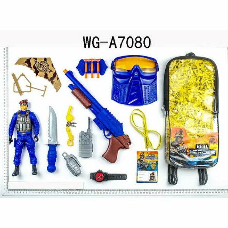 | Состав набора | Аэроплан; Граната; Дробовик; Дротики; Значок; Маска; Нож; Рация; Рюкзак; Свисток; Фигурка - солдат; Часы |
