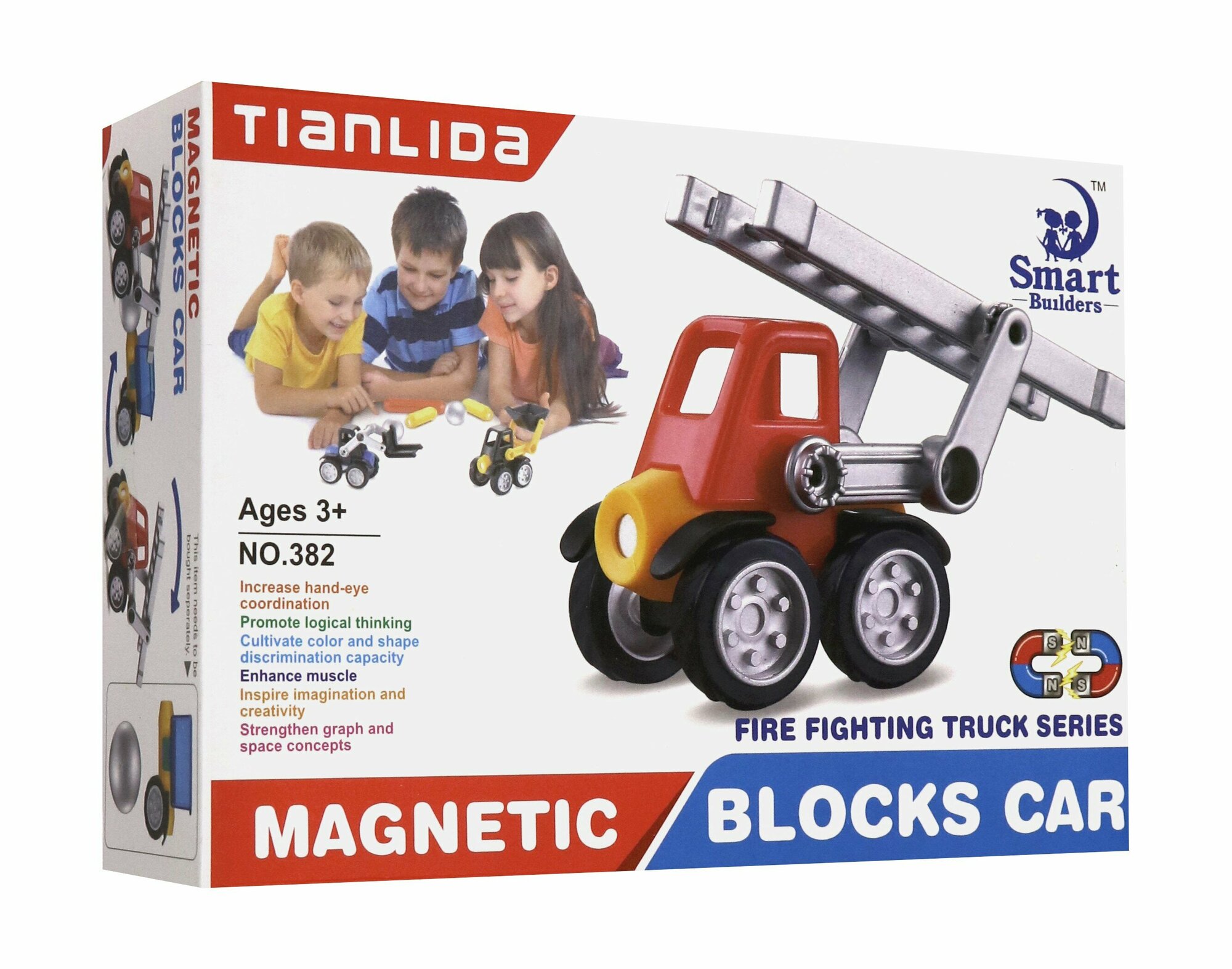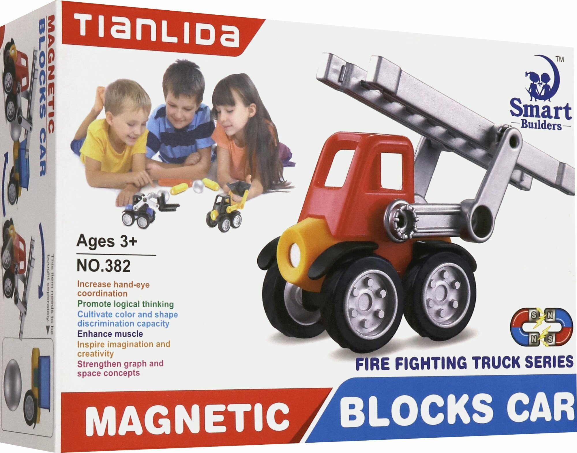 В комплект этого набора-конструктора входит пожарная машинка. Машинка разбирается на несколько пластмассовых частей, а ее серединный блок содержит внутри себя магнит. С его помощью к ней можно легко примагнитить другую машинку, подойдет любая из серии "Конструктор "Tianlida".