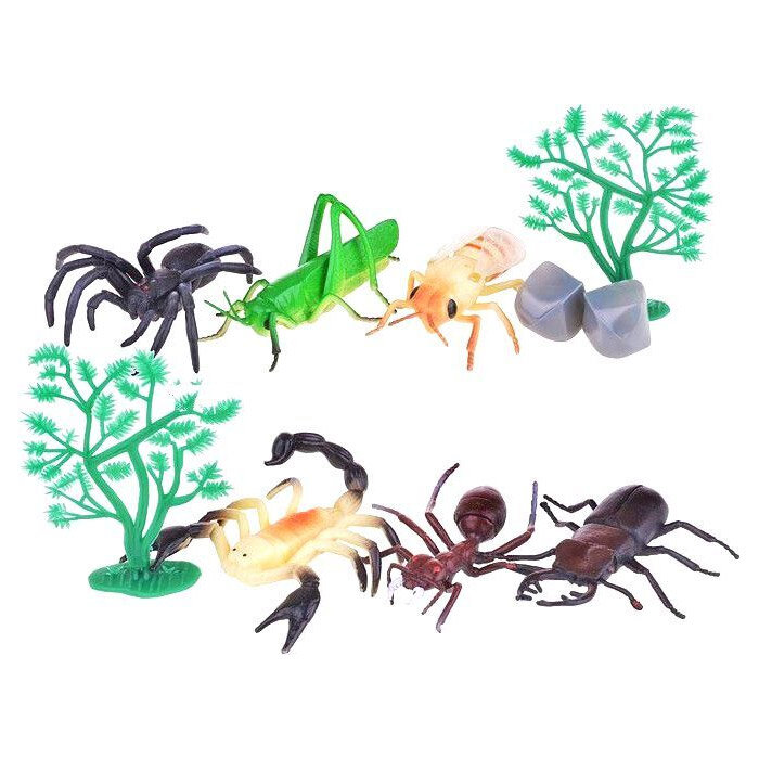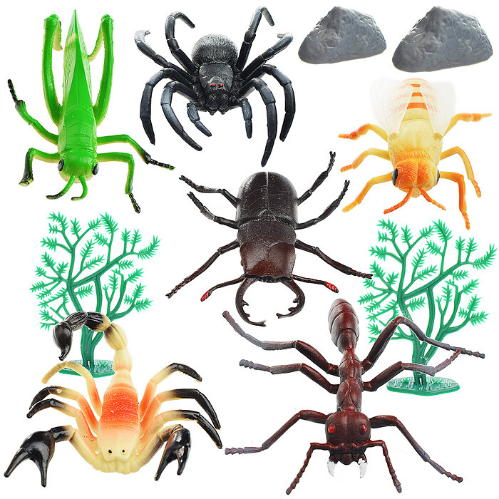 В наборе фигурки: паук, скорпион, жук, кузнечик, муха, муравей, куст (2 шт.), камни (2 шт.).