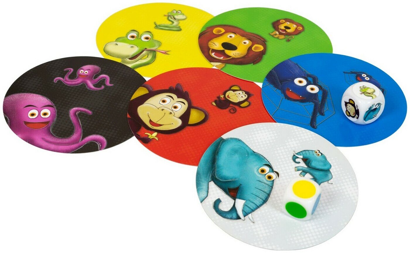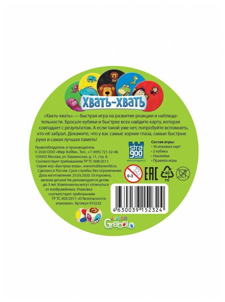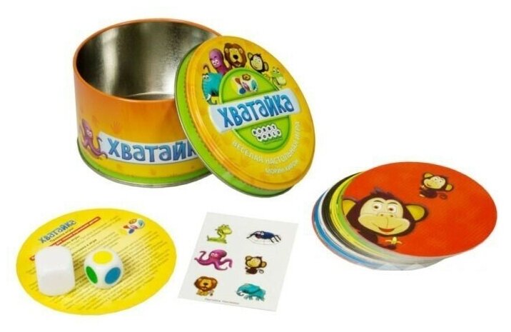 "Хвать-хвать" - быстрая игра на развитие реакции и наблюдательности. Бросьте кубики и быстрее всех найдите карту, которая совпадает с результатом. А если такой уже нет, попробуйте вспомнить, кто её забрал. Докажите, что у вас самые зоркие глаза, самые быстрые руки и самая лучшая память!