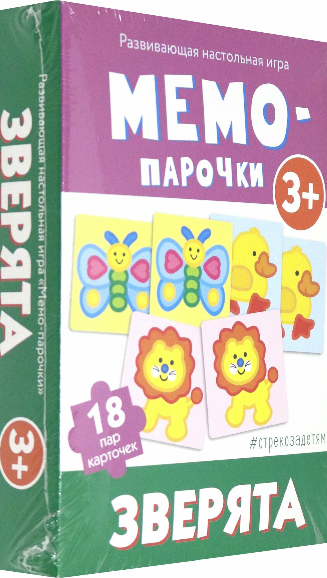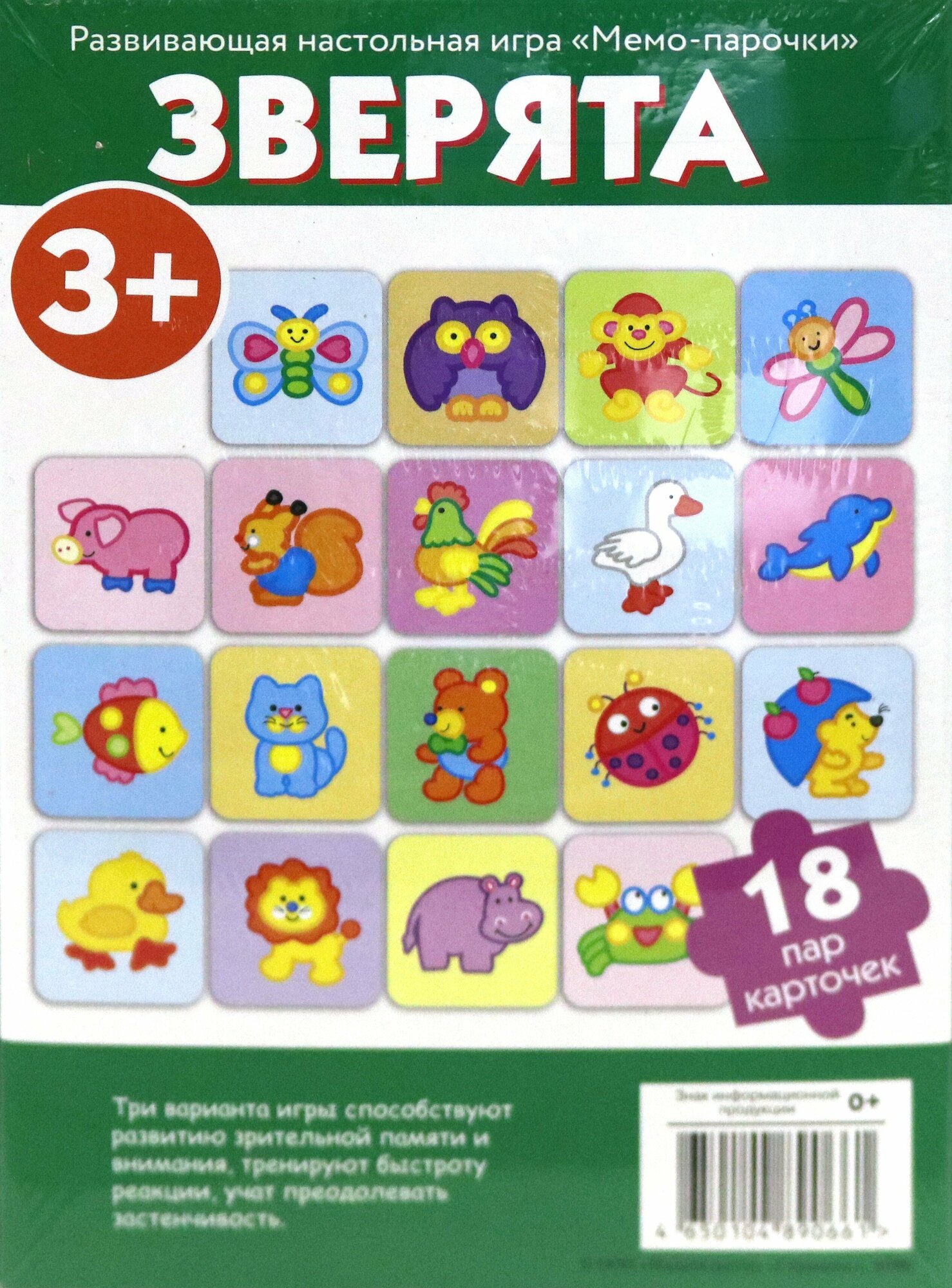 Забавные картинки с изображениями обитателей леса, луга, морей и жарких стран очень нравятся малышам. Игра способствует развитию зрительной памяти, внимания, восприятия, учит сравнивать и различать изображения. В набор входит 36 карточек: 18 парных картинок. В инструкции предлагается три варианта игры: "Зверята", "Собери друзей", "Кто быстрее".