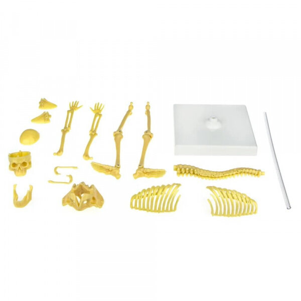 В наборе: верхняя часть черепа, нижняя часть черепа, челюсть, правая лопатка, левая лопатка, левая ключица, правая ключица, тазовая кость, правая рука, левая рука, правая нога, левая нога, правые ребра, левые ребра, позвоночник, стержень, подставка, инструкция.
