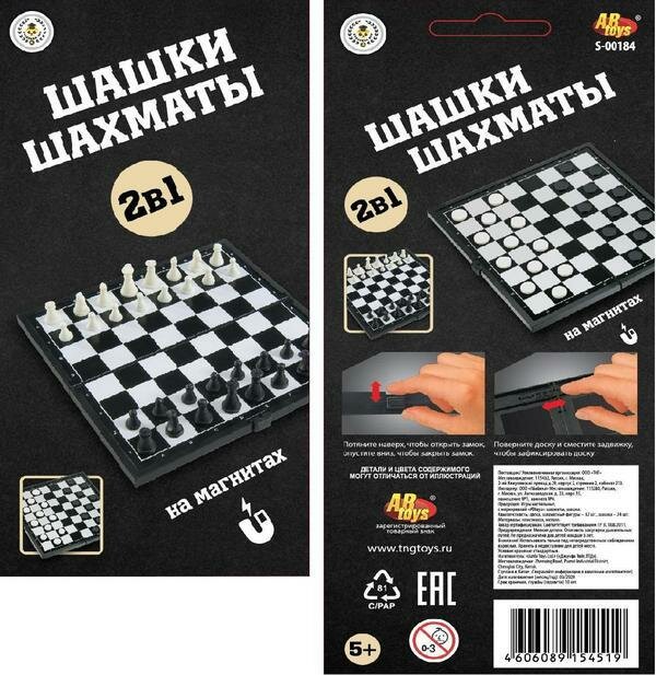 В набор входят шахматы и шашки, все фигуры пластиковые, черно-белого цвета и удобно хранятся в коробке игрового поля. Поле металлическое сверху и пластиковое по краям. Размер фигур удобный для походного варианта, но детям и старше пяти лет такие лучше не давать. Фигуры магнитятся хорошо, если перевернуть поле они не падают вниз.