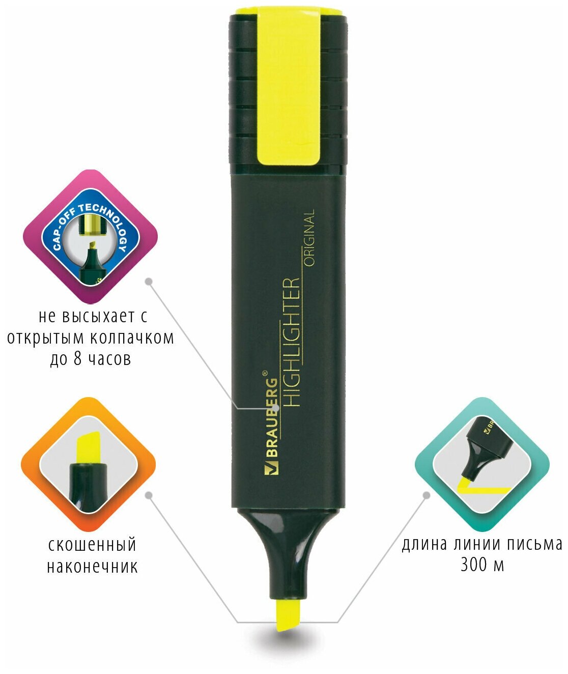Текстовыделители BRAUBERG «ORIGINAL» предназначены для выделения текста на бумаге любого типа, включая факс-бумагу.