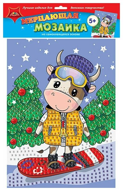 Набор для детского творчества "Мерцающая мозаика" понравится детям от 5-ти лет. На цветной картонной основе числами и цветом показаны места куда необходимо приклеить элементы мозаики. Элементы имеют клеевой слой, поэтому вы обойдетесь без клея и ножниц. В результате получится яркая картинка, которую отлично дополнят глазки и стразы. Набор включает цветную картонную основу размером 25,5 х 35 см, самоклеящиеся цветные элементы мозаики, глазки и стразы. Занятия с помощью этого набора развивают мелкую моторику, внимание, аккуратность. Все необходимые детали для поделки входят в состав набора.