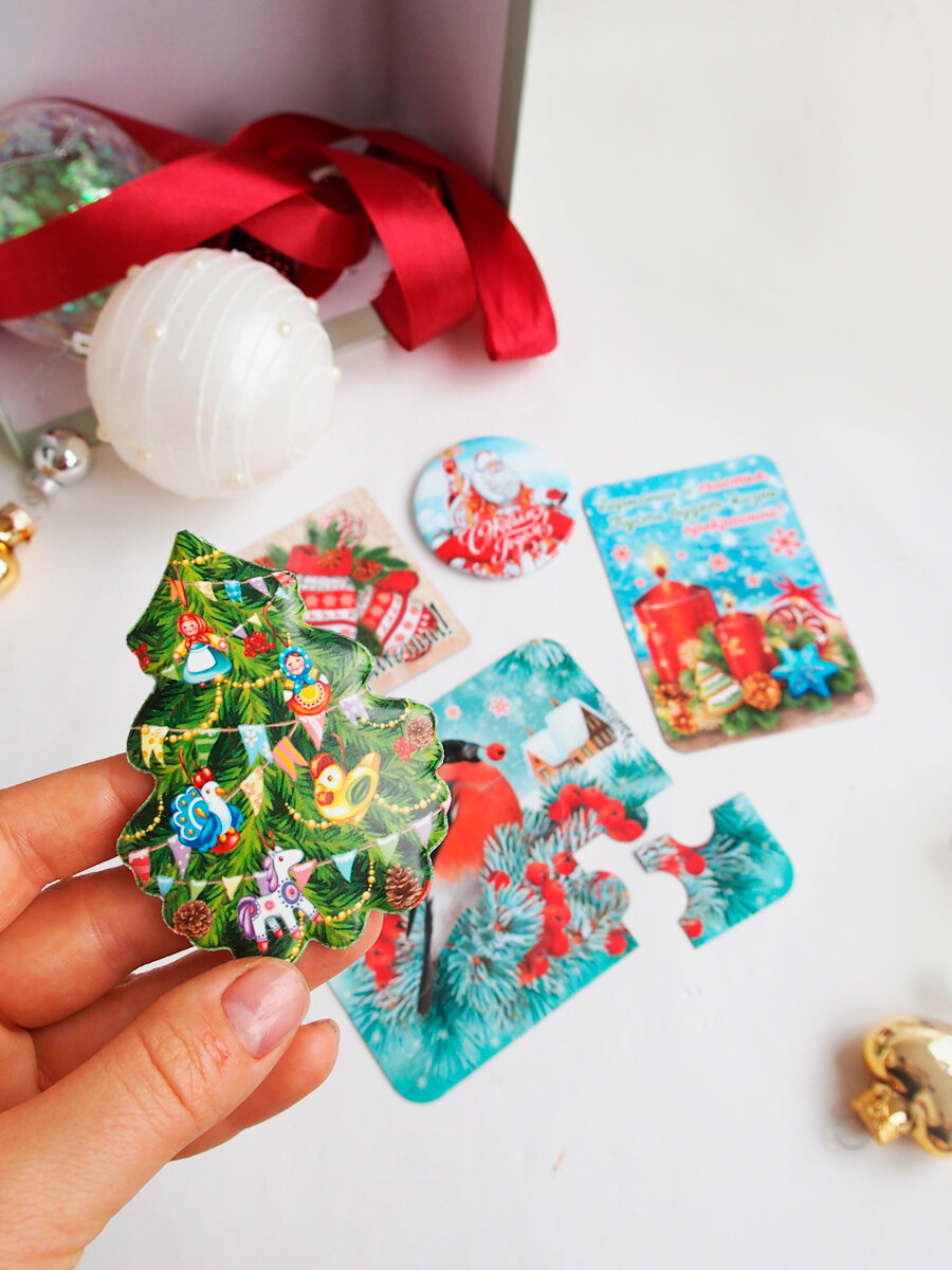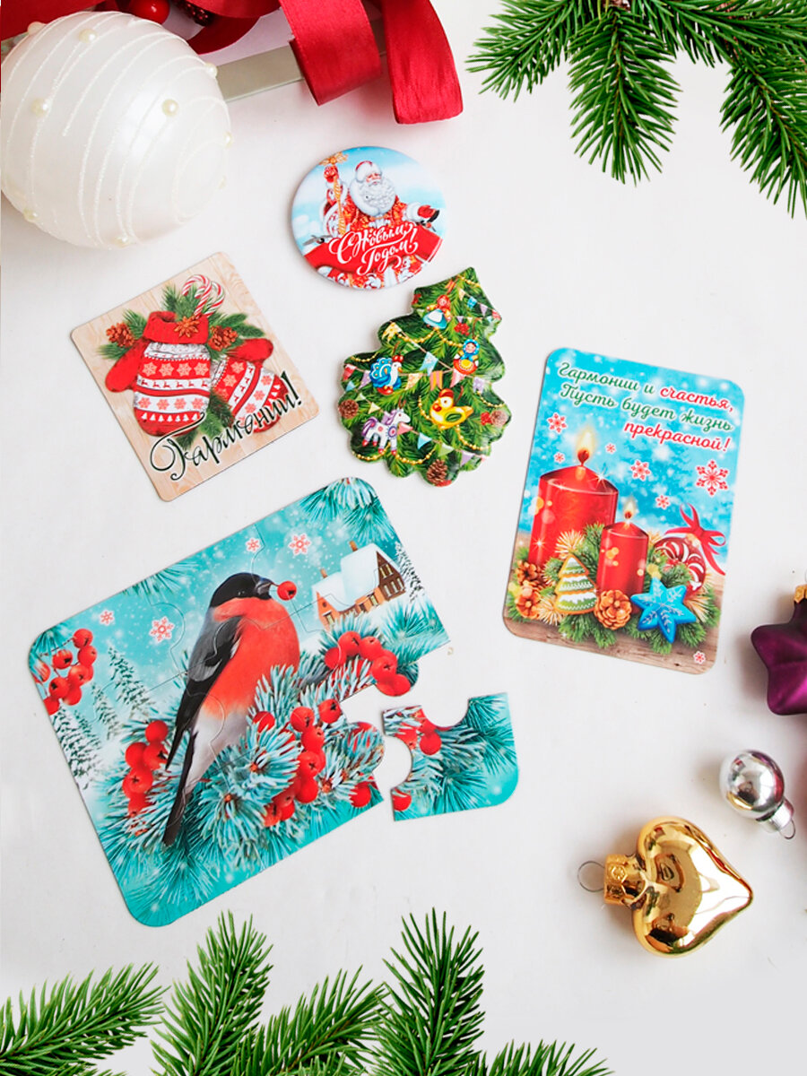 Набор состоит из 5 красочных новогодних магнитов разной формы, размера и способа изготовления. Он включает: - плоские виниловые магниты нескольких размеров, - мягкий магнит в форме елочки 62х82 мм, - закатной металлический магнит d56 мм, - магнит-пазл 95х120 мм. Такое разнообразие порадует каждого, кто получит этот набор в подарок! Дарите предвкушение праздника!