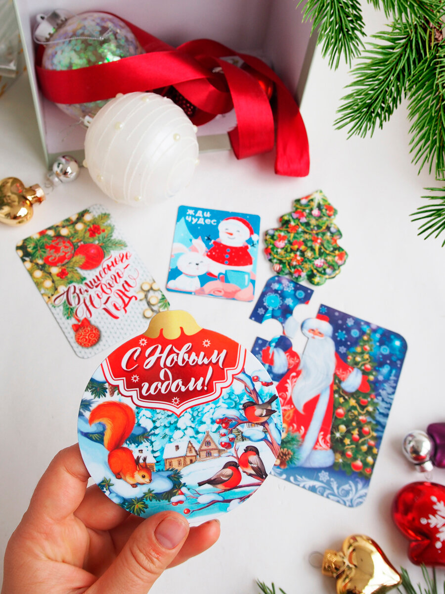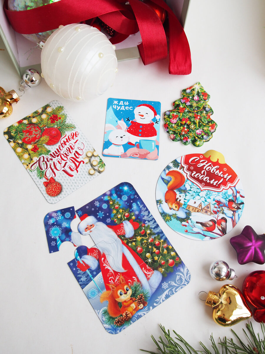 Набор состоит из 5 красочных новогодних магнитов разной формы, размера и способа изготовления. Он включает: - плоские виниловые магниты нескольких размеров, - мягкий магнит в форме елочки 62х82 мм, - закатной металлический магнит d56 мм, - магнит-пазл 95х120 мм. Такое разнообразие порадует каждого, кто получит этот набор в подарок! Дарите предвкушение праздника!