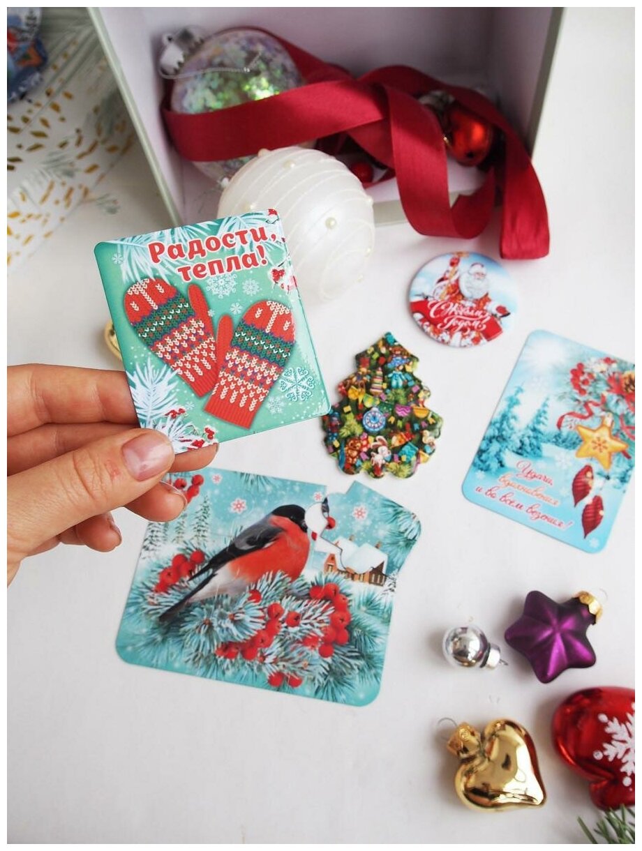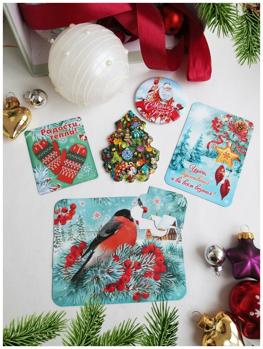 Набор состоит из 5 красочных новогодних магнитов разной формы, размера и способа изготовления. Он включает: - плоские виниловые магниты нескольких размеров, - мягкий магнит в форме елочки 62х82 мм, - закатной металлический магнит d56 мм, - магнит-пазл 95х120 мм. Такое разнообразие порадует каждого, кто получит этот набор в подарок! Дарите предвкушение праздника!