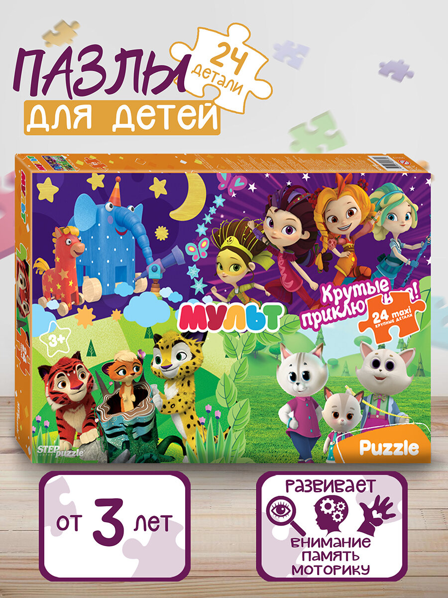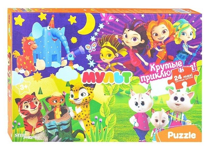 Этот пазл состоит из 24 крупных деталей. Его картинка - это коллаж с некоторыми героями современных мультфильмов, которые показывают по телеканалу "Мульт".