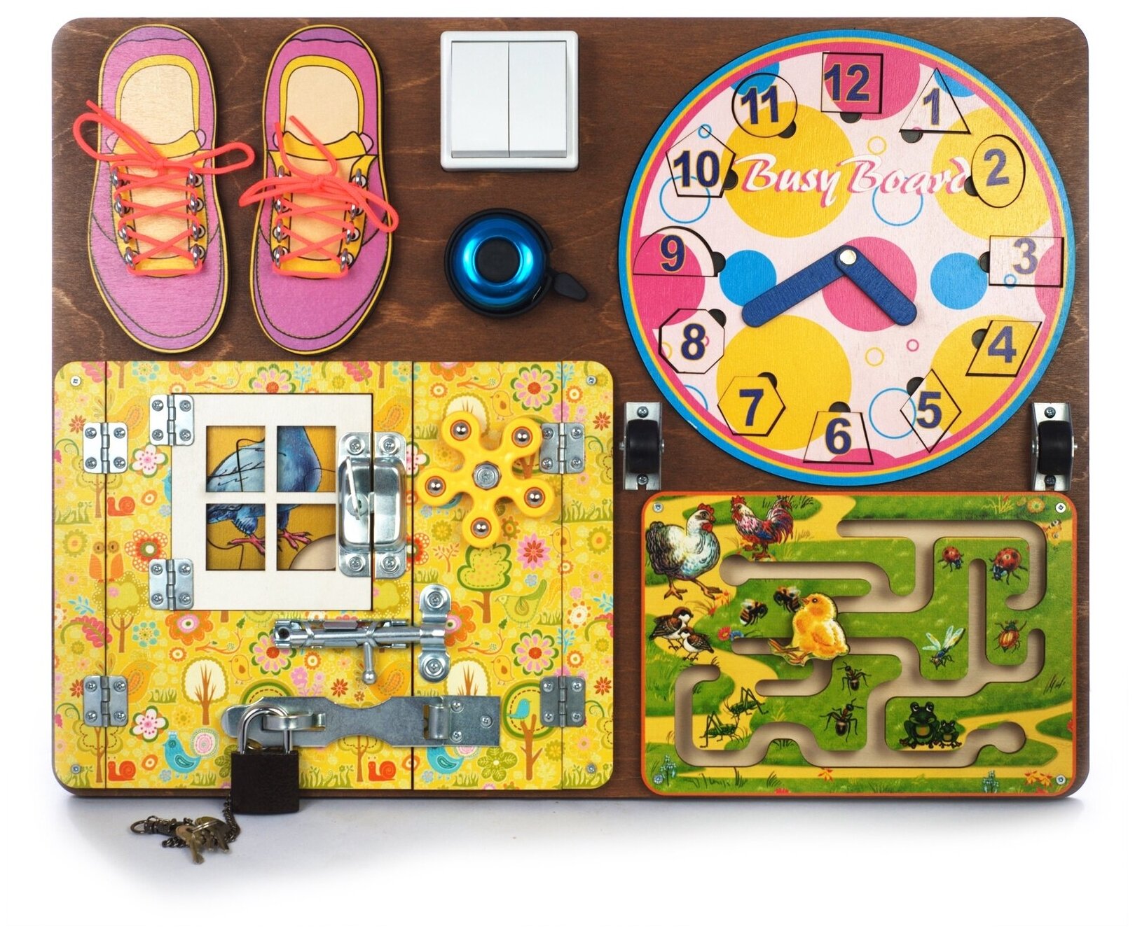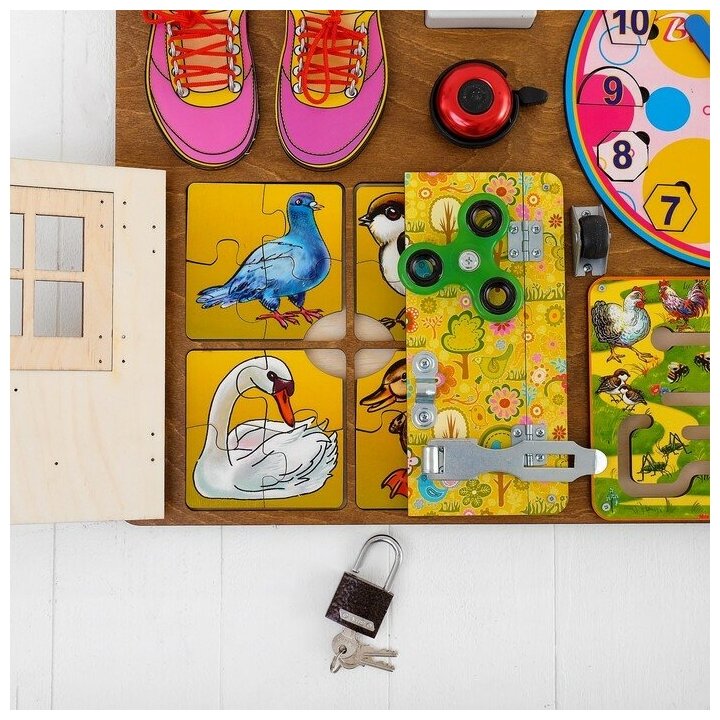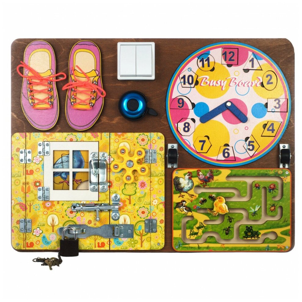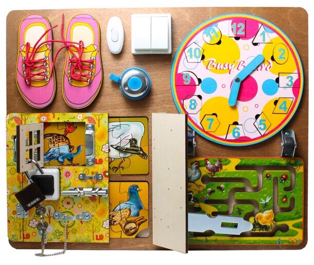На доске Busy Board можно увидеть и оригинальный лабиринт, и большое количество различных замков, к которым нужно подобрать ключ, и выключатели разнообразной формы, куда можно нажать, и даже небольшой звонок, издающий забавные звуки. Все это позволит ребенку увидеть загадку в самых казалось бы обычных предметах домашнего обихода.