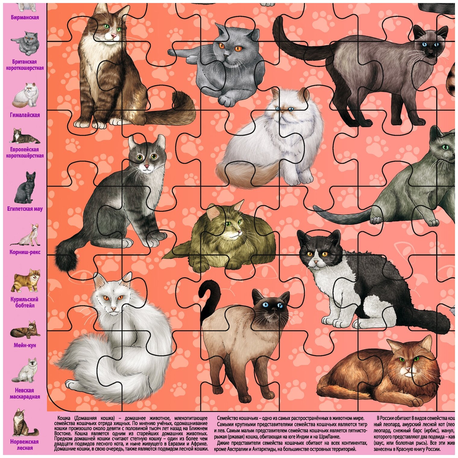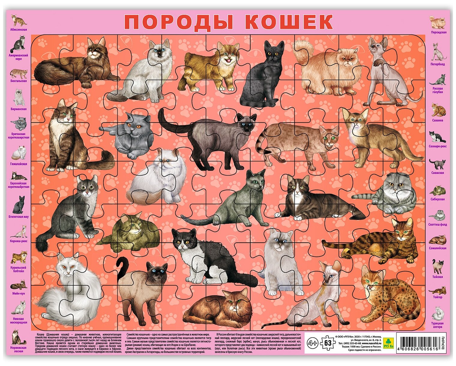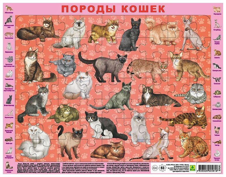 Породы кошек. Детский пазл на подложке 63 элемента РУЗ Ко