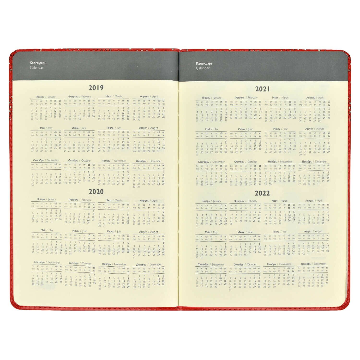 | Особенности | без полей; закладка-ляссе; календарь; скругленные углы; справочная информация |