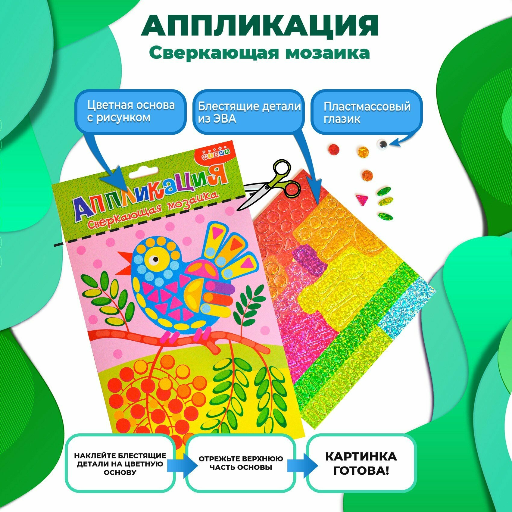 В комплекте: картонная основа с рисунком, пластина с самоклеящимися деталями из ЭВА с голографической плёнкой, пластмассовый глазик.