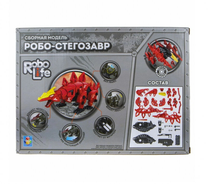 Сборная модель "Робо-стегозавр" красный 49 деталей (Т19096) 1toy Робо-стегозавр, красный, 49 деталей, коробка 28*8*21 см, движение, звук