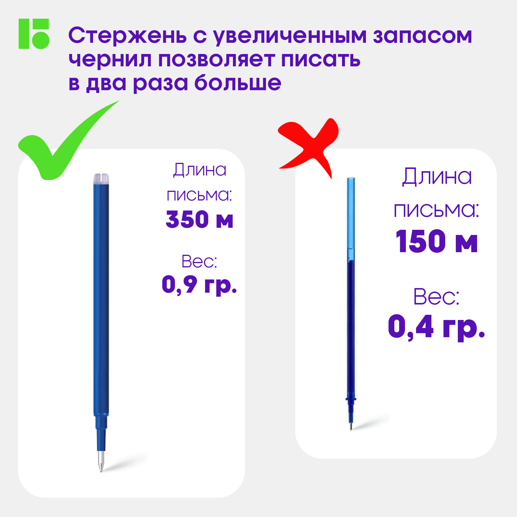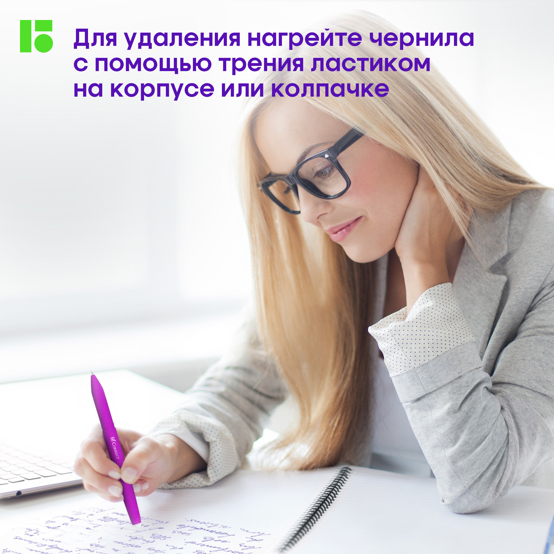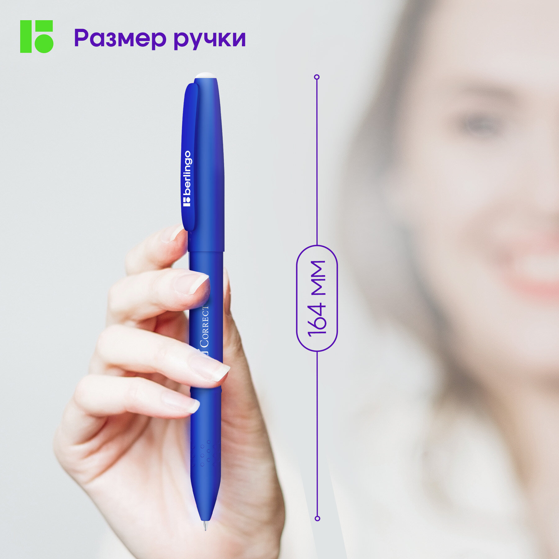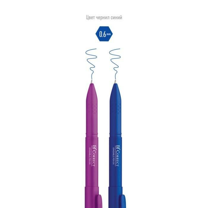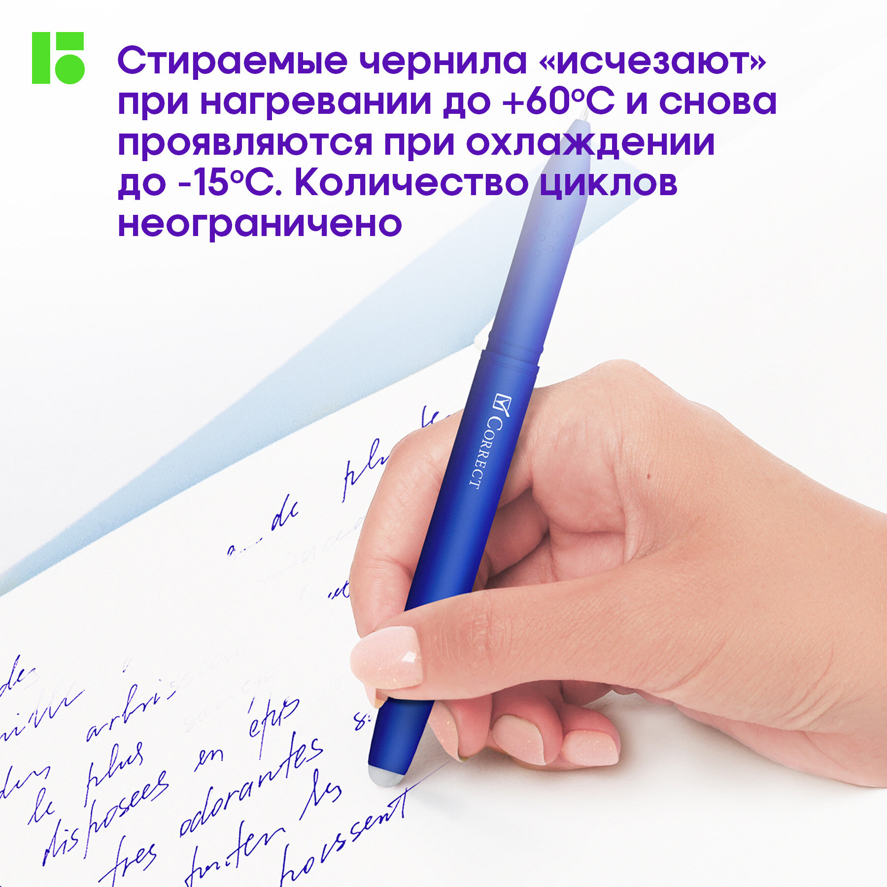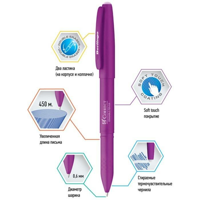 Хит продаж – стираемая гелевая ручка Berlingo Correct позволяет многократно писать и стирать текст. Приятное на ощупь бархатистое покрытие прорезиненного корпуса Soft touch создает дополнительный комфорт при использовании. Термочувствительные чернила становятся невидимыми при нагревании до 60°С и выше. Нагрев достигается трением встроенным в колпачок ластиком, для удобства ещё один ластик располагается на корпусе ручки. Обесцвеченные чернила проявляются при температуре ниже -18°С. Количество циклов написания/стирания ограничено износостойкостью бумаги. Увеличенное количество чернил позволяет ручке писать до 300 метров, что в 1,5 раза больше средней длины письма стираемых ручек. Диаметр пишущего узла составляет 0,6 мм, благодаря чему получается тонкая, аккуратная линия.
