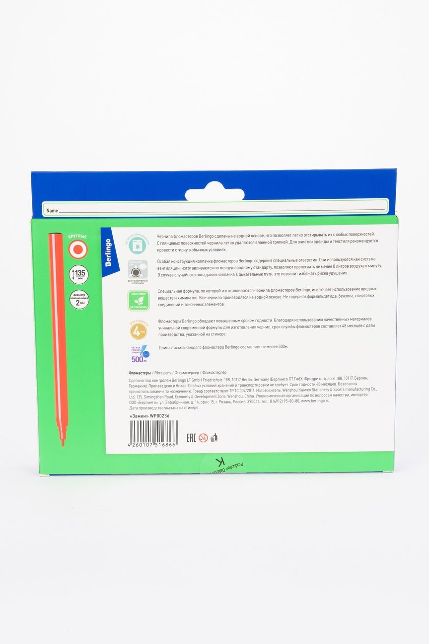 Легкосмываемые чернила, вентилируемый колпачок, нетоксичны, корпус изготовлен из полипропилена. Упакованы в картонную матовую коробку с петлей-европодвесом. Длина линии не менее 500 м.