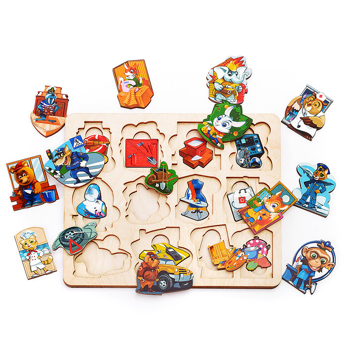 Двухслойная доска с вкладышами. Верхние вкладыши - животные в образе представителей разных профессий. Под ними расположены предметы, которые используются в этих профессиях. Вкладыши с предметами также можно вынимать. С таким набором можно проводить игры с детьми разного уровня подготовки. Использовать вкладыши можно как вместе с доской, так и отдельно. Малышам можно предложить 2-3 вкладыша с животными и предметами и предложить им составить пары. Постепенно количество одновременно предлагаемых пар можно увеличивать. Вкладыши в игре сложной формы и поэтому, подбирать для них места на доске, занятие не самое простое. Для начала можно не вынимать предметы и предложить ребенку поставить сверху животных, которые на своей работе используют эти предметы. Таким образом малыш будет находить место для вкладыша не по форме, а по смыслу. Когда ребенок поймет принцип игры, можно вынуть все вкладыши и дать ему самостоятельно заполнить все отверстия. В ходе занятий с доской "Кто есть кто?" ребенок, с одной стороны, познакомится с названиями профессий, узнает, кто какие предметы использует в работе, а, с другой стороны, потренирует мелкую моторику рук и глазомер. Размер доски: 21х24,5 см Материал: фанера Страна производства: Россия