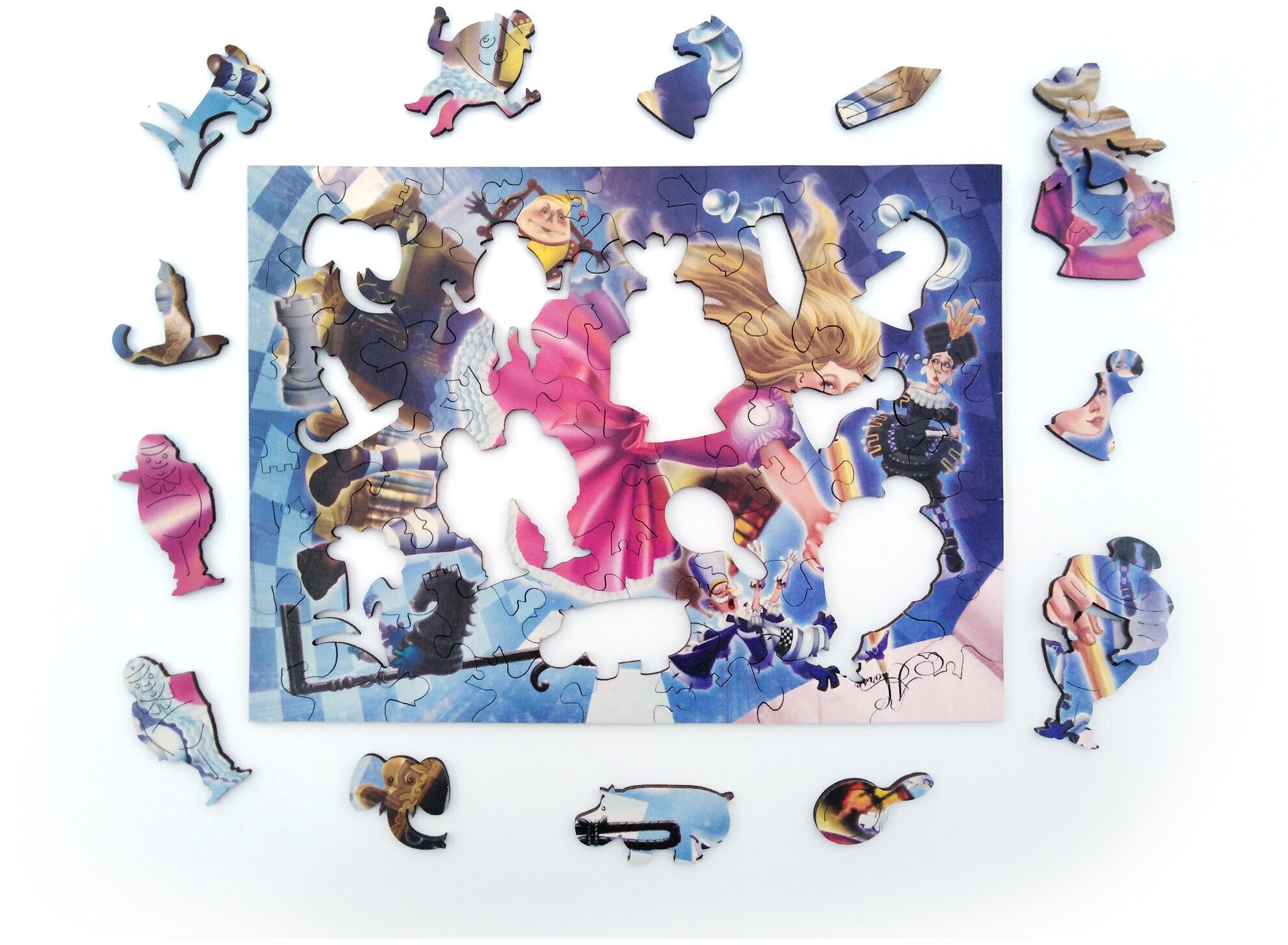 Фигурный пазл отличается от стандартного необычной формой деталей. Кроме того, часть деталей выполнены в форме предметов, связанных с тематикой картинки. В данном случае это, персонажи и предметы связанные со сказкой Алиса в стране Чудес. Детали пазла выполнены из фанеры. Рисунок нанесен прямо на дерево с помощью специального принтера, он долговечен и не сотрется даже после многократных сборок. Такой пазл понравится и детям и взрослым, ведь сборка доставляет визуальное и тактильное удовольствие.