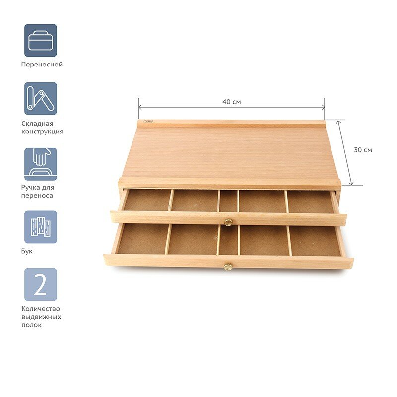 Органайзер для компактного хранения и переноски пастели и карандашей. Сохраняет порядок на рабочем месте, не позволяет мелкам крошиться и осыпаться. Два выдвижных лотка разделены на зоны для сортировки мелков по типам и цветам.