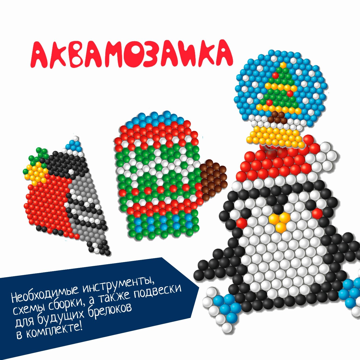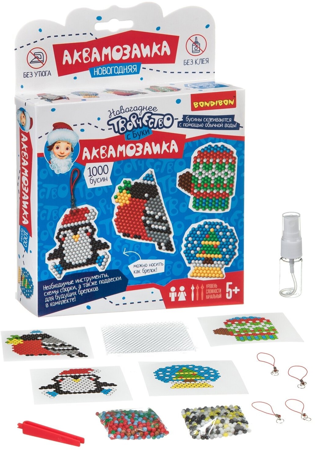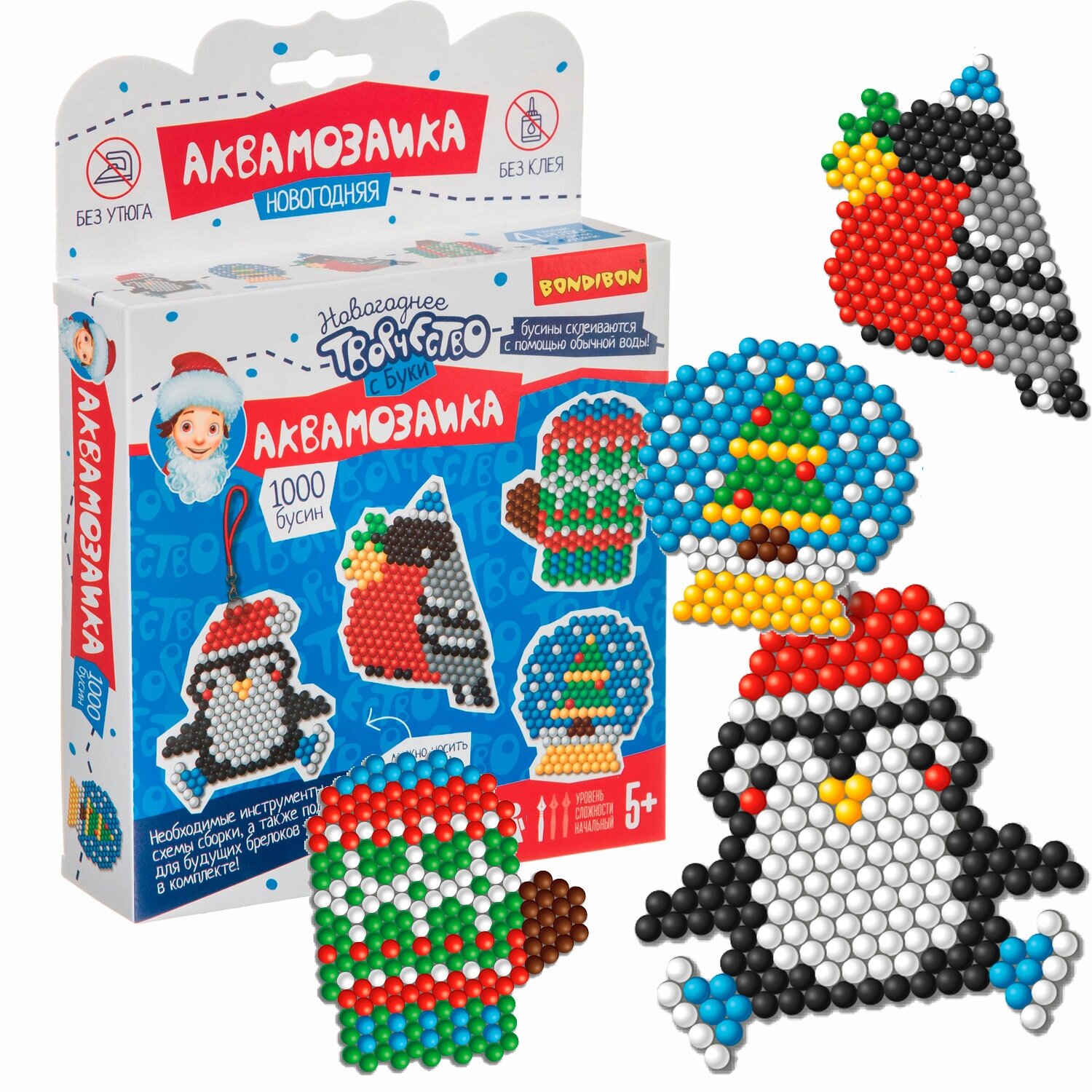 Набор для детского творчества. Новогодняя аквамозаика. 1000 бусин! Большие фигурки, с которыми можно играть или носить с собой как брелок! Аквамозаика - увлекательный творческий набор! Из цветных пластиковых бусин создаются различные фигурки довольно необычным способом. Фигурку необходимо собрать на форме-планшете и смочить сверху водой. Обработка водой размягчит бусинки и скрепит их между собой.