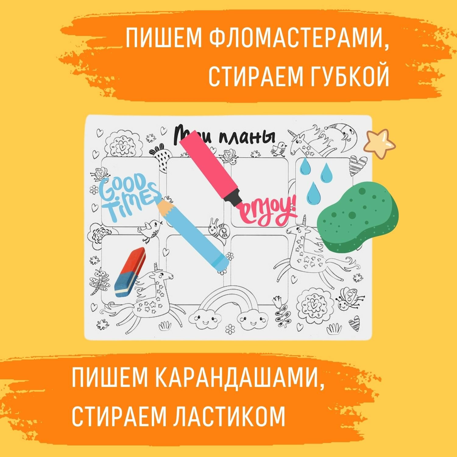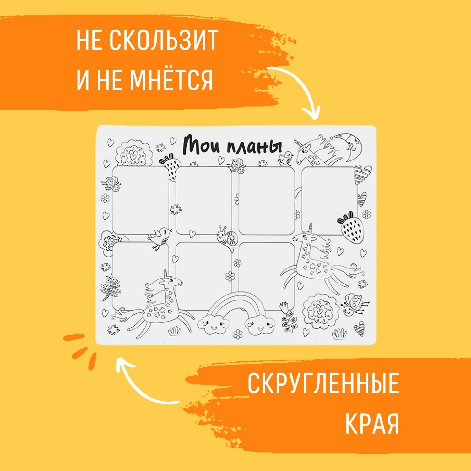 Наши новые коврики-раскраски - это занимательные игры, которые помогут ребенку стать более организованным. Теперь записывать планы на неделю можно прямо на поверхности коврика, а потом стирать записи без труда! Для творческих детей приготовлен особенный сюрприз - милые единороги, которых можно раскрашивать в любые цвета.