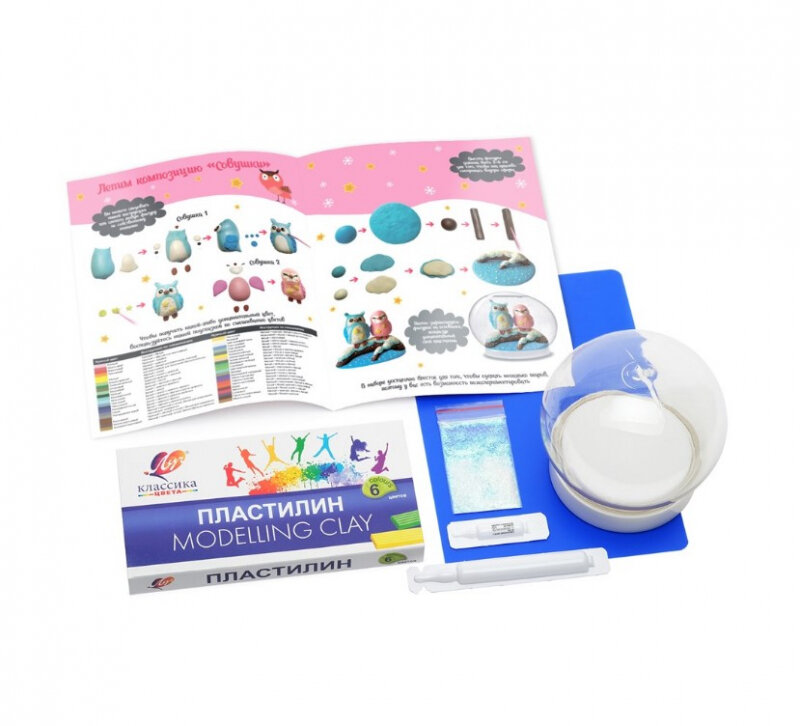 В наборе: подробная инструкция, сферическая основа для шара, цветной пластилин, доска для лепки, подставка для композиции, специальные жидкости, блестки для создания снежного эффекта.
