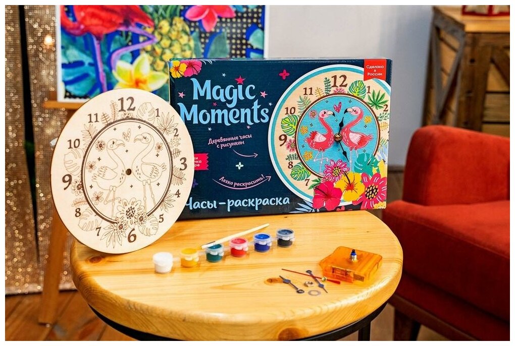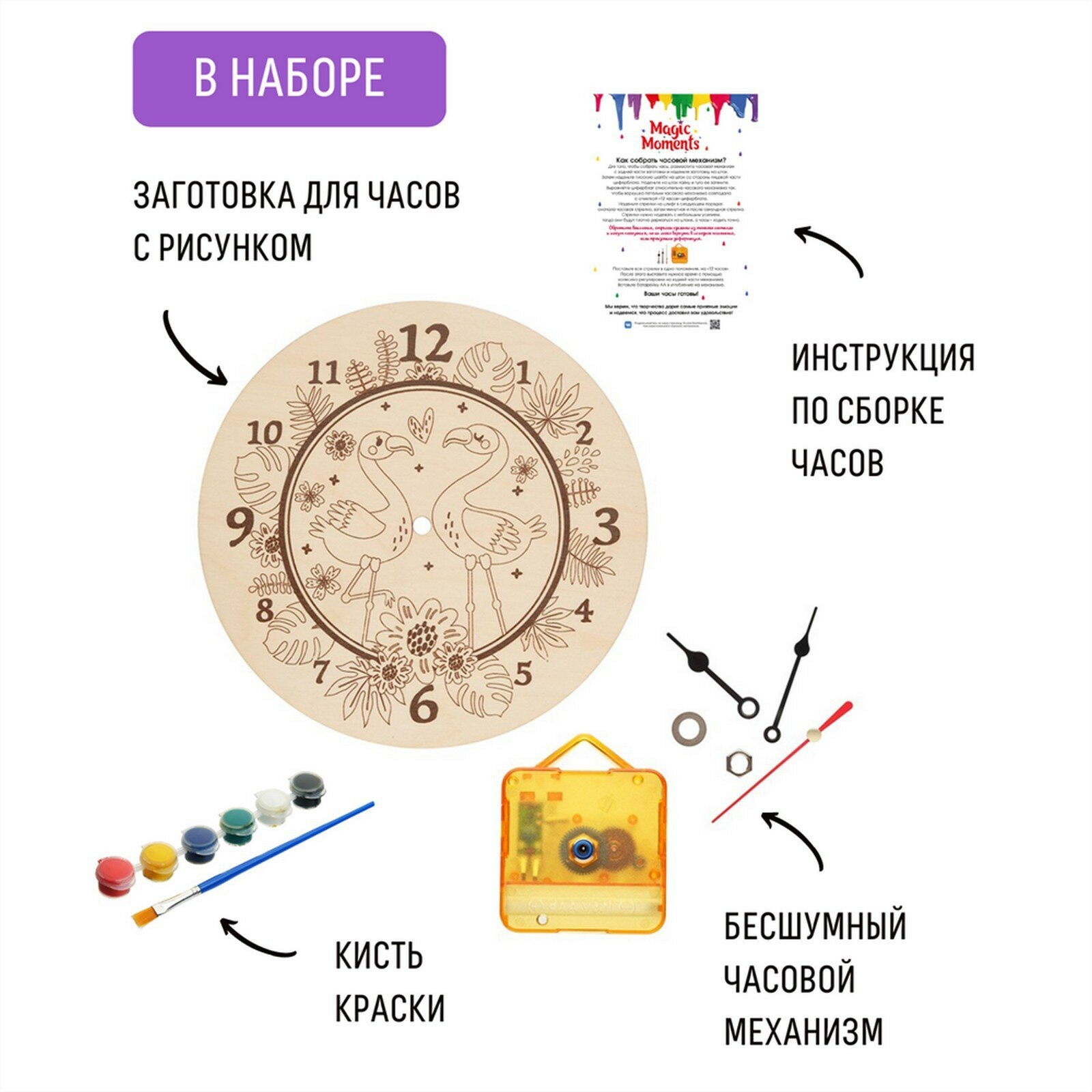 В наборе: деревянная заготовка под раскрашивание, часовой механизм, краски и кисточка