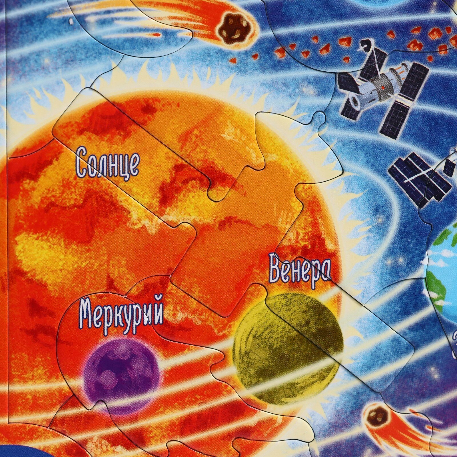 Развивающий пазл «Солнечная система» ориентирован на активное развитие речи, памяти, внимания, логического и образного мышления. Пазл интересен тем, что некоторые его детали необычной формы. Они сделаны в виде фигур - например, ребёнок сможет разглядеть тут комету, ракету, МКС. Всего пазл состоит из 21 детали. На обороте планшета написаны интеерсные факты о том, что такое Солнечная система и из чего она состоит.