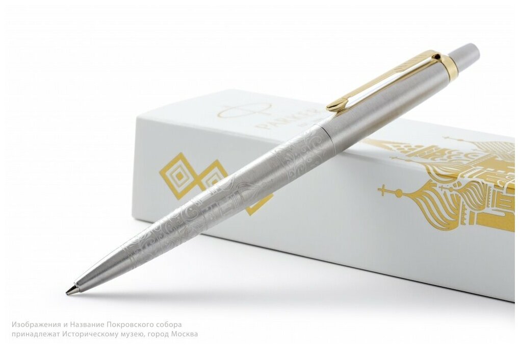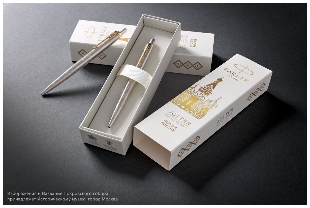 Ручка "Jotter Россия" сделана из отполированной нержавеющей стали. Для основного рисунка был выбран Покровский собор (Храм Василия Блаженного) - православный храм на Красной площади, памятник русской архитектуры XVI века. Он выгравирован на корпусе ручки. Лазерную гравировку собора дополняет витиеватый узор. Клип-стрела покрыт золотом гальваническим методом. Ручка упакована в подарочную коробку цвета слоновой кости также с изображением Покровского собора в золоте.