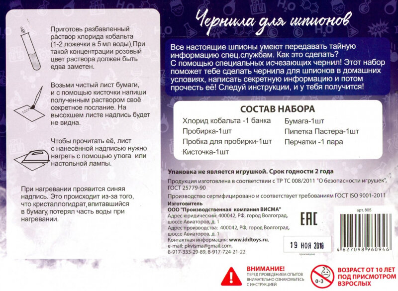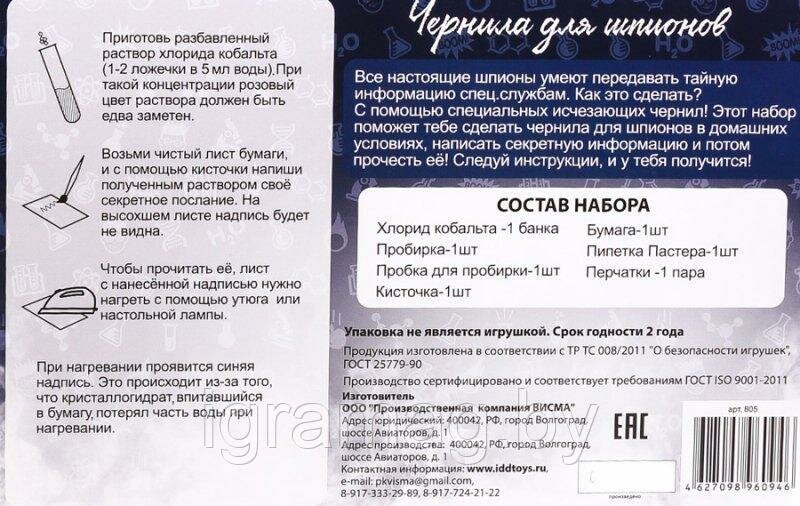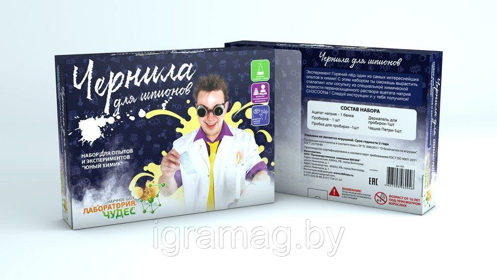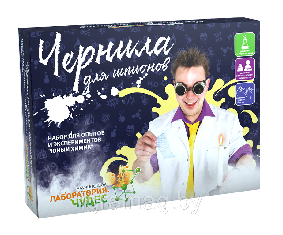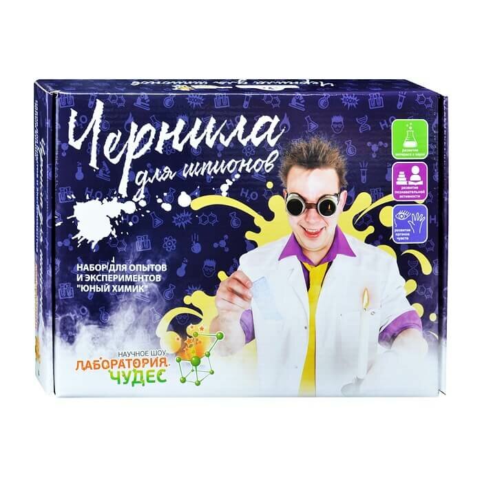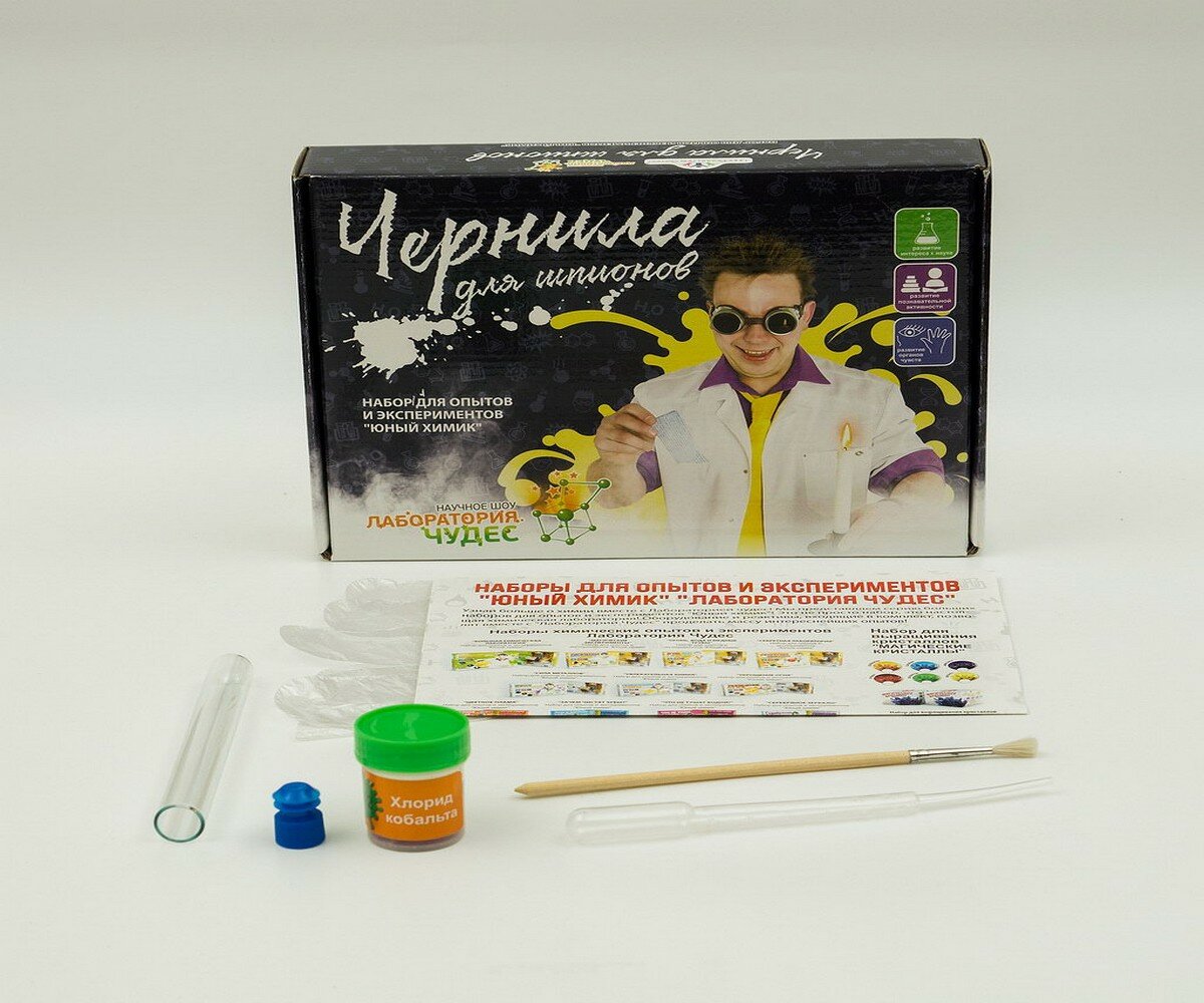 Для творческих и любознательных детей подойдет набор "Чернила для шпионов" из серии "Юный химик". В набор входят пробирка и пробка для нее, держатель для пробирки, чашка Петри и химические реагенты. К набору прилагается инструкция, следуя которой, дети смогут без труда создать необходимое вещество. Получившиеся в результате опыта чернила дети могут использовать в играх шпионов. Если нанести их на бумагу, они исчезают. Следуя инструкции, чернила можно проявить, когда это необходимо.