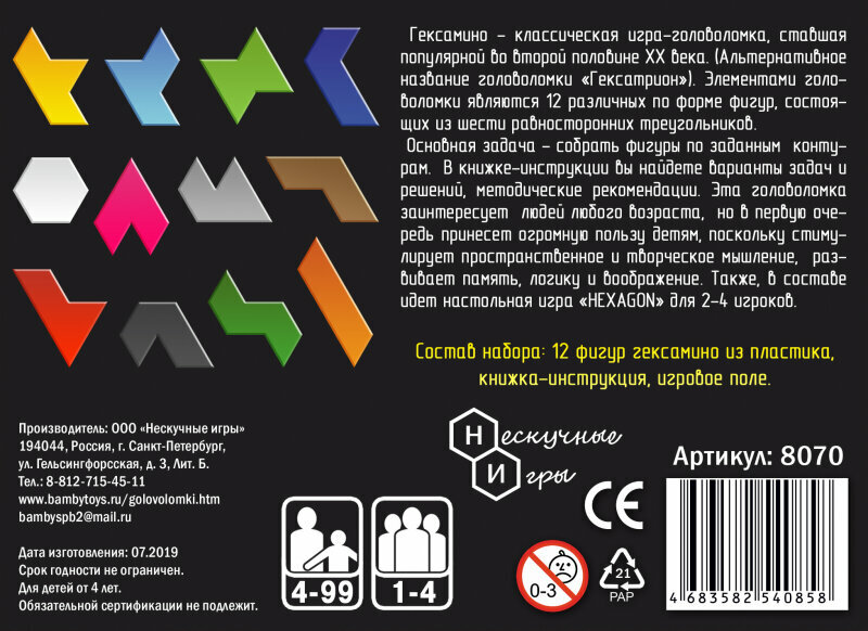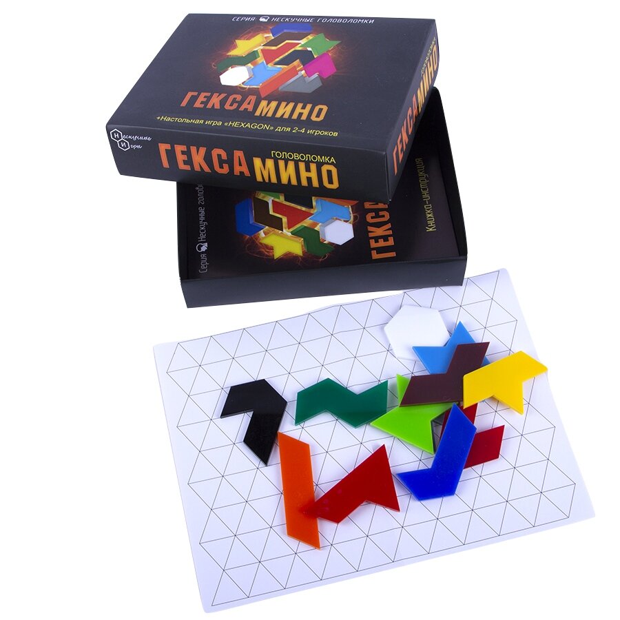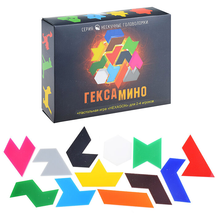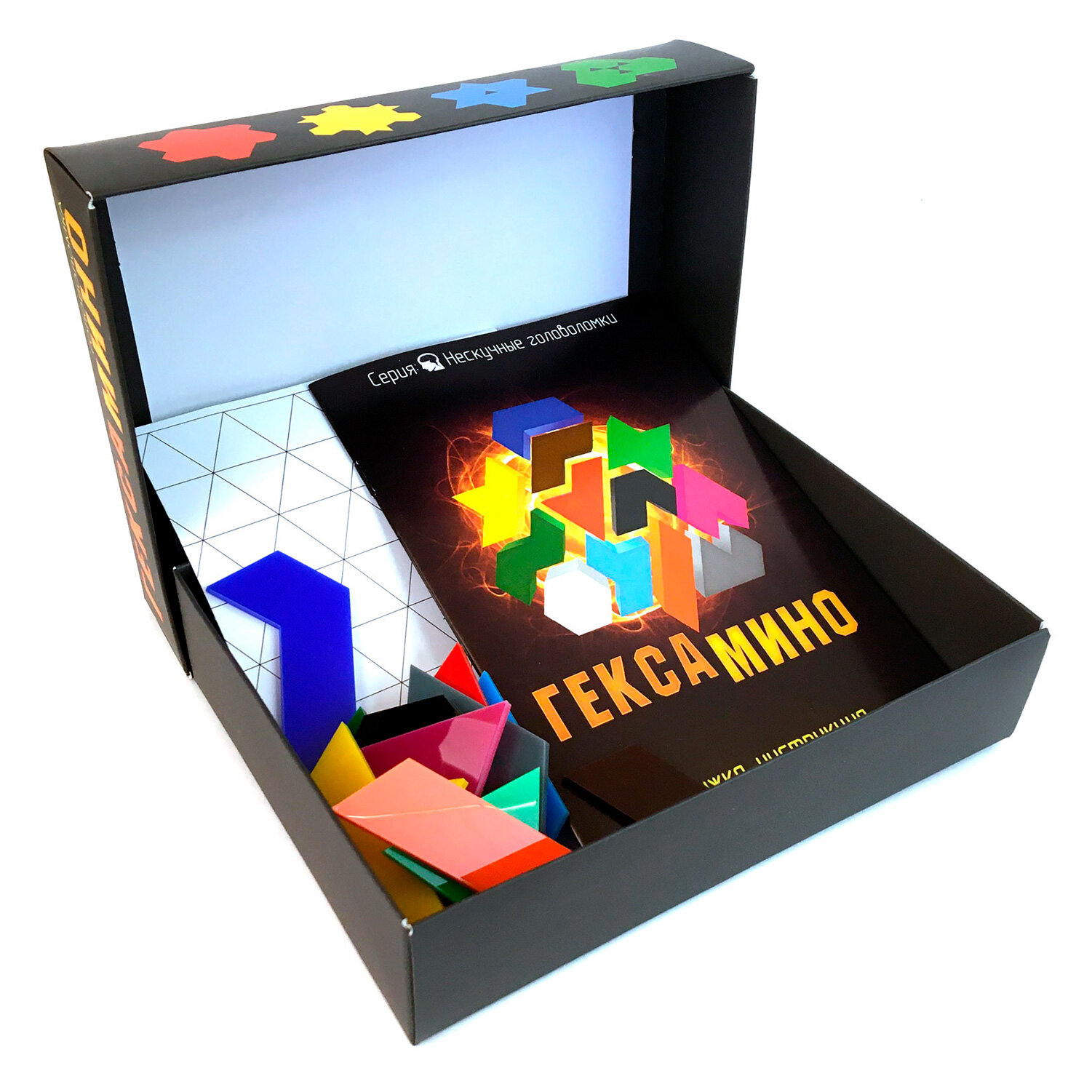 Состав набора: 12 фигур гексамино из пластика, книжка-инструкция, игровое поле.