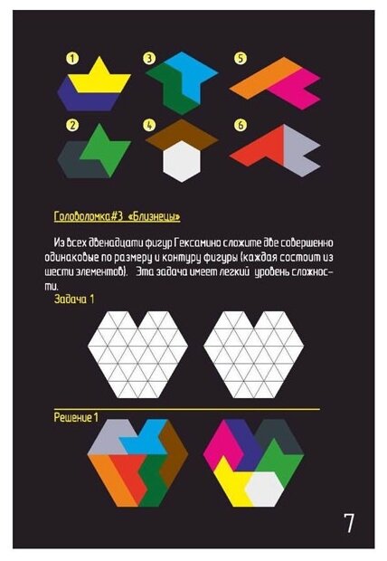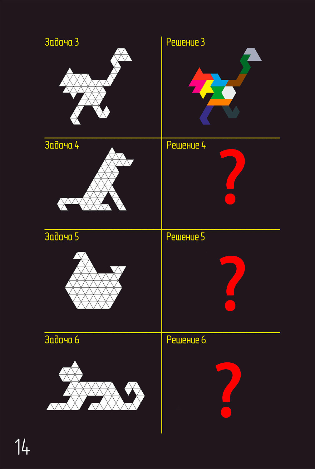 Суть головоломки - составить фигуры из всех элементов по заданному шаблону. В инструкции множество задач разной степени сложности. Большой минус инструкции - задание и решение находятся рядом, это очень неудобно, приходится ответ закрывать бумажкой. -