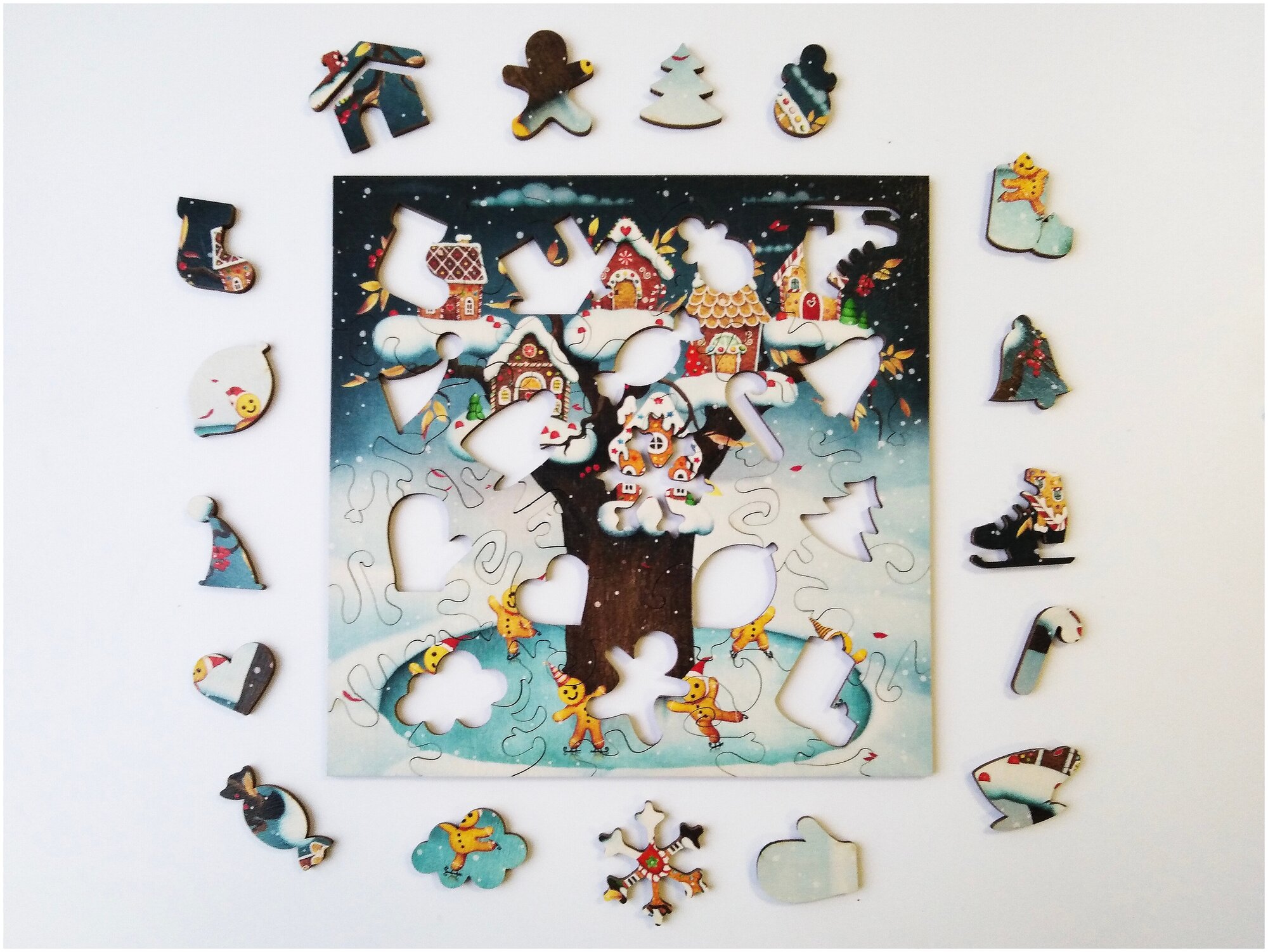 Как эльфы перед Рождеством, мы трудились именно для вас, чтобы создать ощущение сказки и надеемся, что нам это удалось. Мы наносим изображение прямо на дерево, чтобы вы могли прочувствовать его структуру и приятный запах. Цветовая гамма картин очень приятна глазу, она мягкая и вместе с тем красочная. Мы абсолютно точно вымеряем и вырезаем каждую деталь, так что в сторону сомнения и давайте уже приступим к делу и скорее откроем тайну нашего пазла!