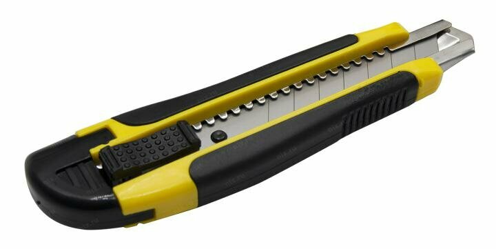 Нож канцелярский, усиленный, с прорезиненным корпусом.