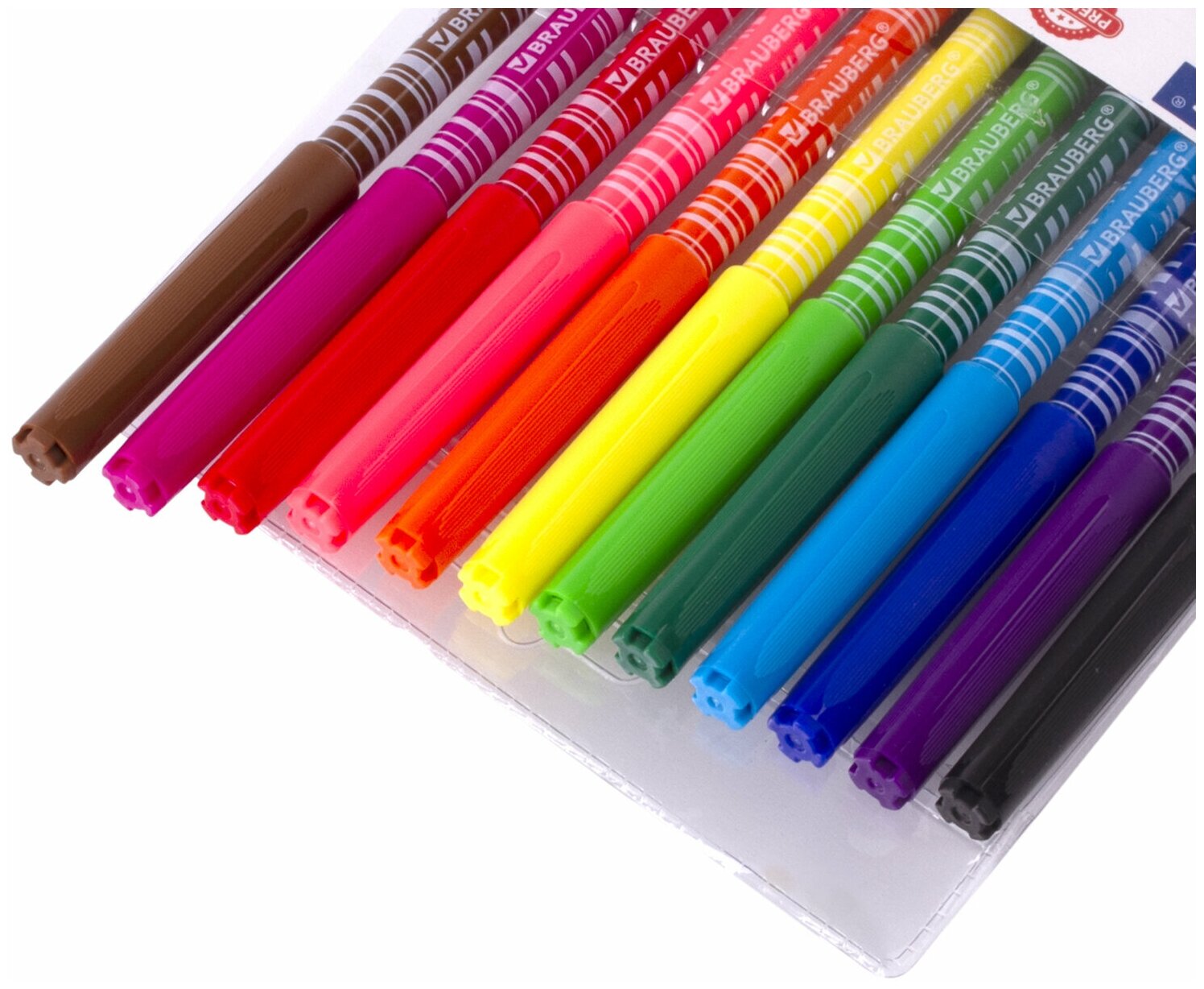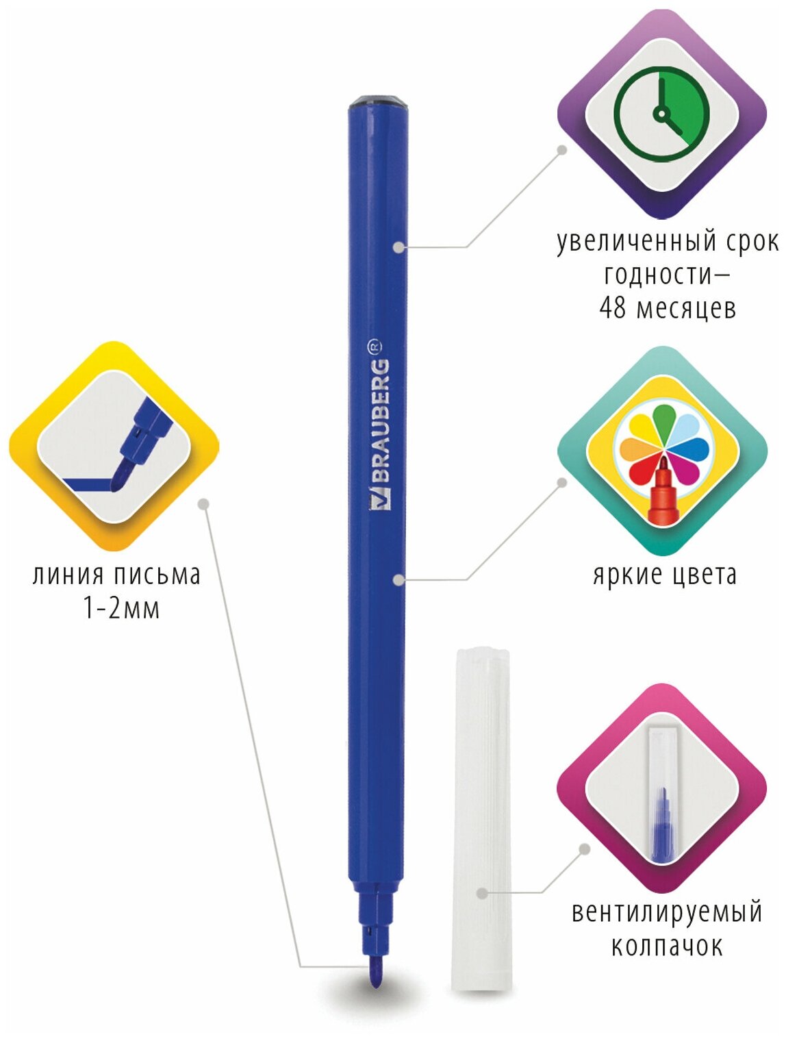 Имеют удобную круглую форму. Длина корпуса — 150 мм, диаметр — 8,2 мм. Благодаря линии письма 1-2 мм процесс раскрашивания становится легким и приятным. Быстросохнущие чернила предотвращают смазывание рисунка. Благодаря полипропиленовому корпусу срок службы фломастеров значительно увеличивается. Колпачок имеет специальные прорези для вентиляции. Фломастеры обладают экономным расходом чернил, при этом длина линии письма достигает 500 метров. Рекомендованы для детей от 3-х лет. Рисование фломастерами BRAUBERG «PREMIUM» способствует развитию воображения, мелкой моторики рук у детей, координации движений кистей и пальцев и повышает способность концентрироваться и фокусировать внимание.