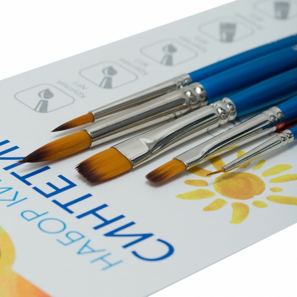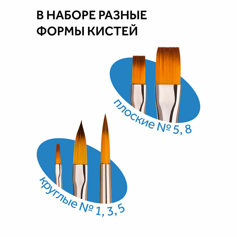 Набор кистей из синтетики в блистере: круглые №1, 3, 5, плоские № 5, 8.