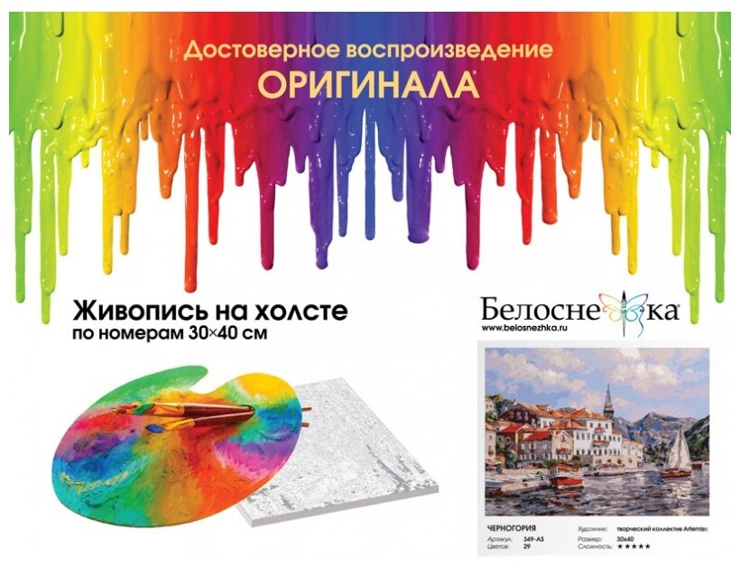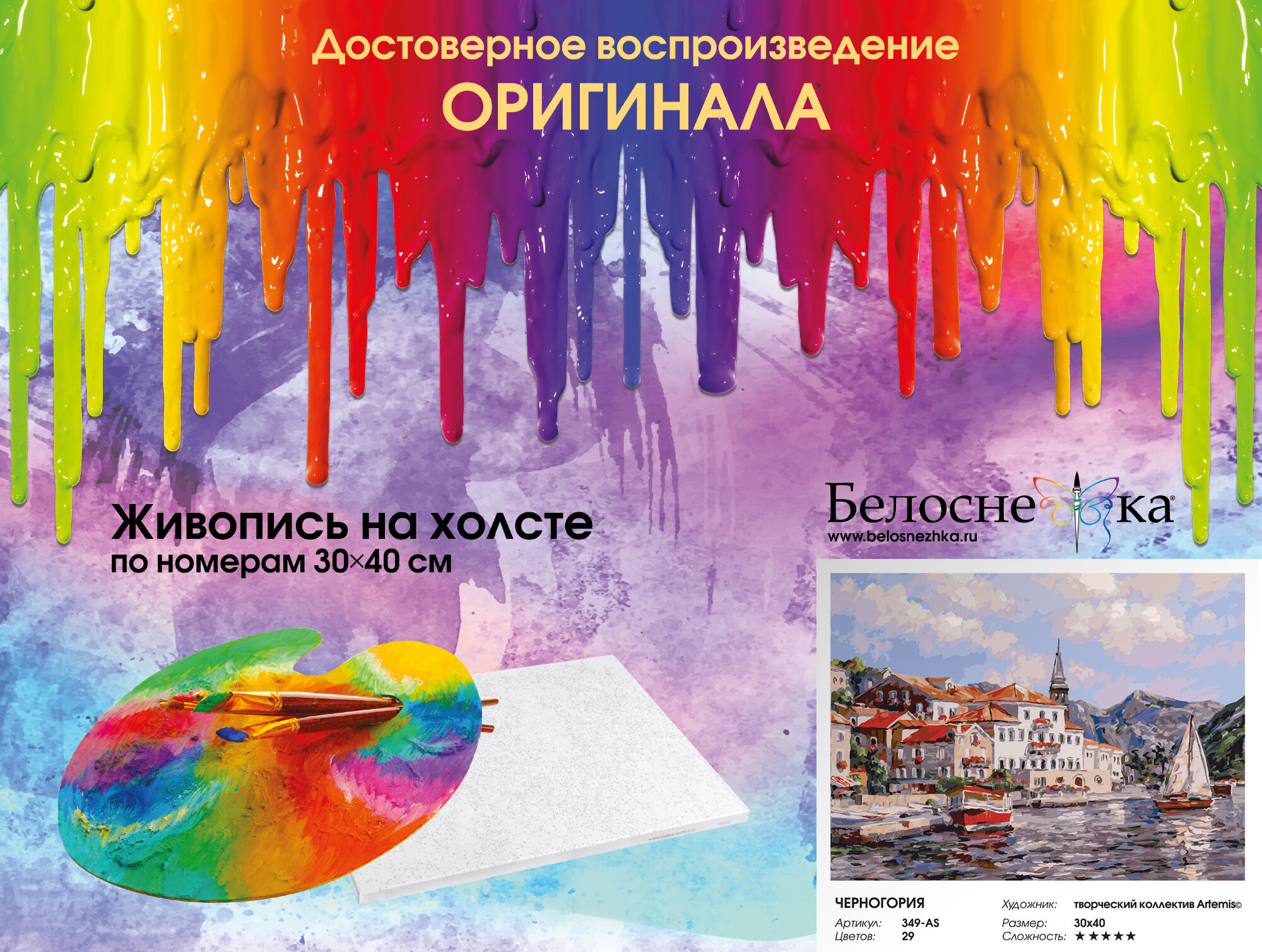 Набор для творчества Живопись на холсте: 349-AS ЧерногорияРисование по номерам-очень увлекательное занятие. Картина по номерам это как правило холст или картон, на которых нанесен рисунок, разбитый на пронумерованные сектора. Каждый сектор нужно закрасить краской из палитры цветов с тем же номером.Покупая картину по номерам от Белоснежка вы можете быть уверены, что только у нас в наборах для рисования осуществлено Достоверное воспроизведение ОРИГИНАЛА, так как мы используем только ОРИГИНАЛЬНЫЕ авторские работы художников и качественную оцифровку изображения с мельчайшей детализацией. Все это нам позволило сделать Достоверное воспроизведение ОРИГИНАЛА работы художника, а благодаря большому количеству цветов красок в комплекте мы добились передачи максимальной достоверности изображения. Под каждую картину разрабатывается своя цветовая палитра, высокая сложность картины позволяет добиться требуемой Достоверности воспроизведения ОРИГИНАЛА произведения.