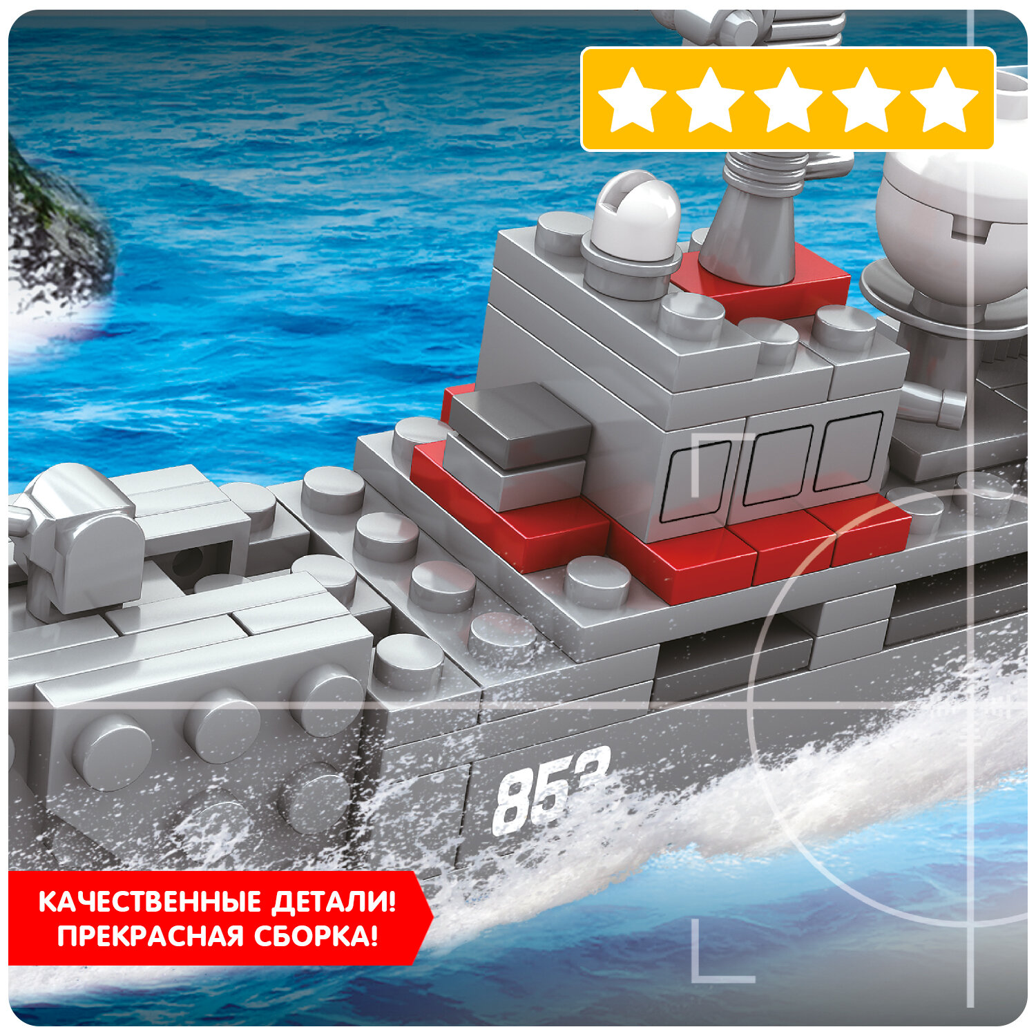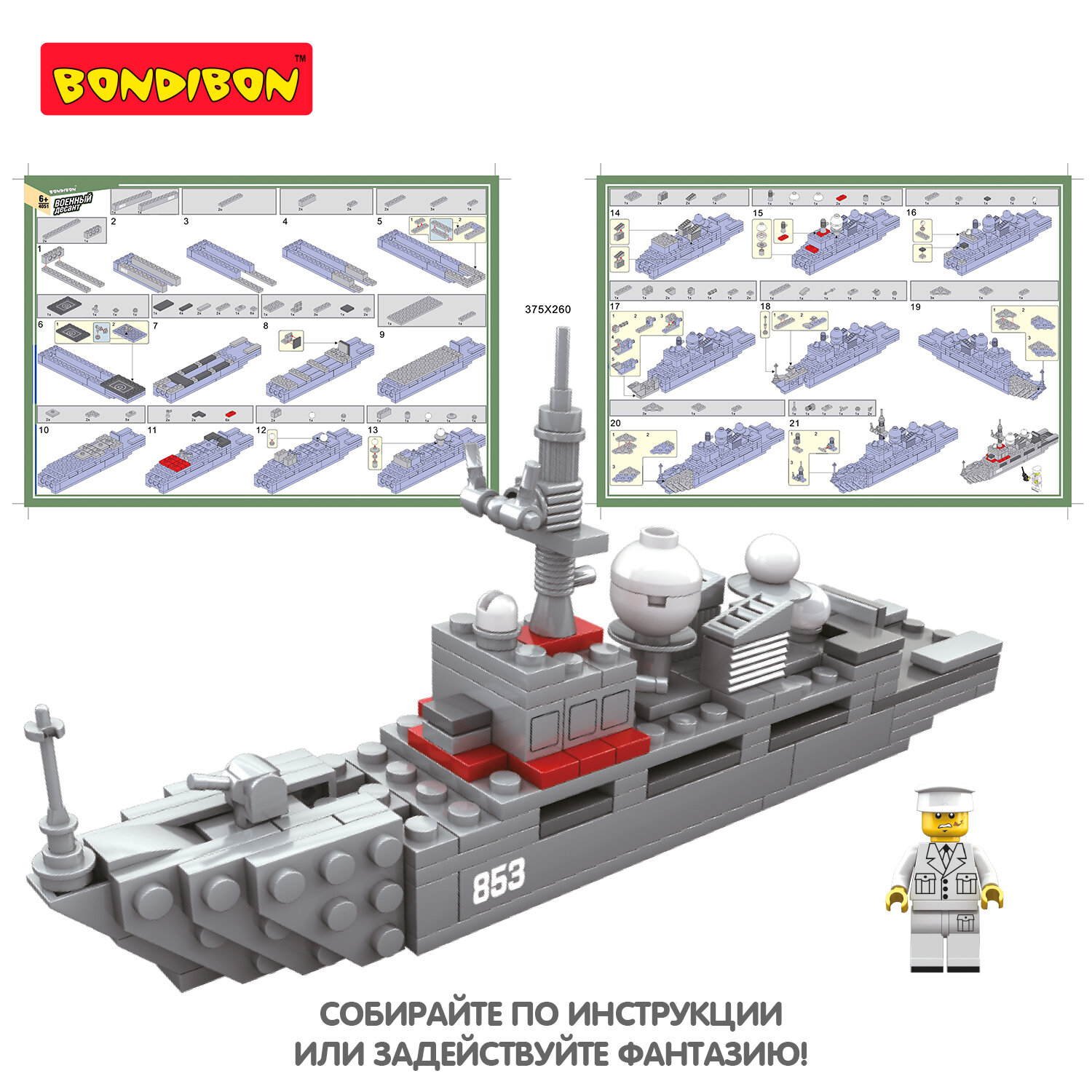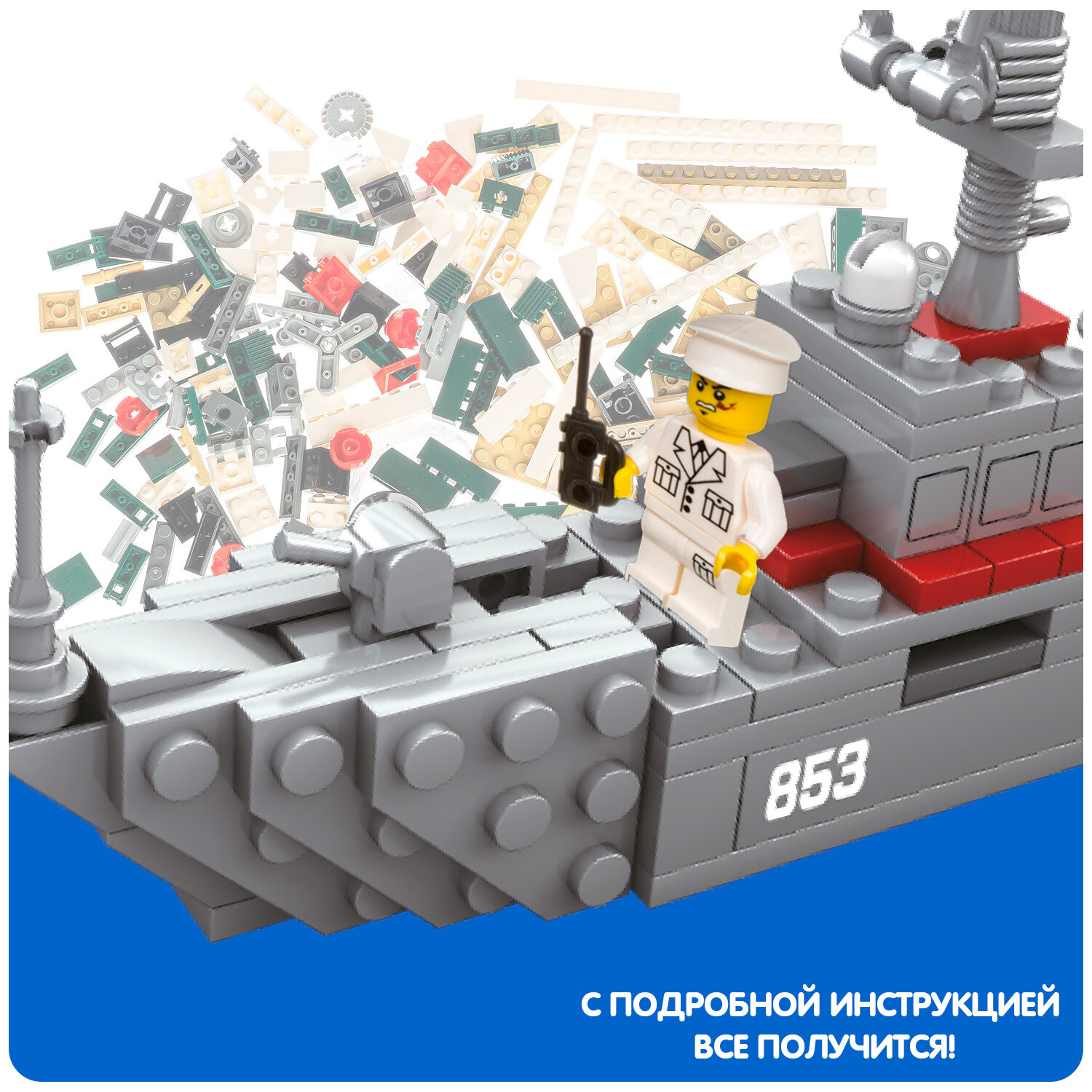 В комплект входит: 138 деталей для сбора военного корабля, а также фигурка отважного адмирала.