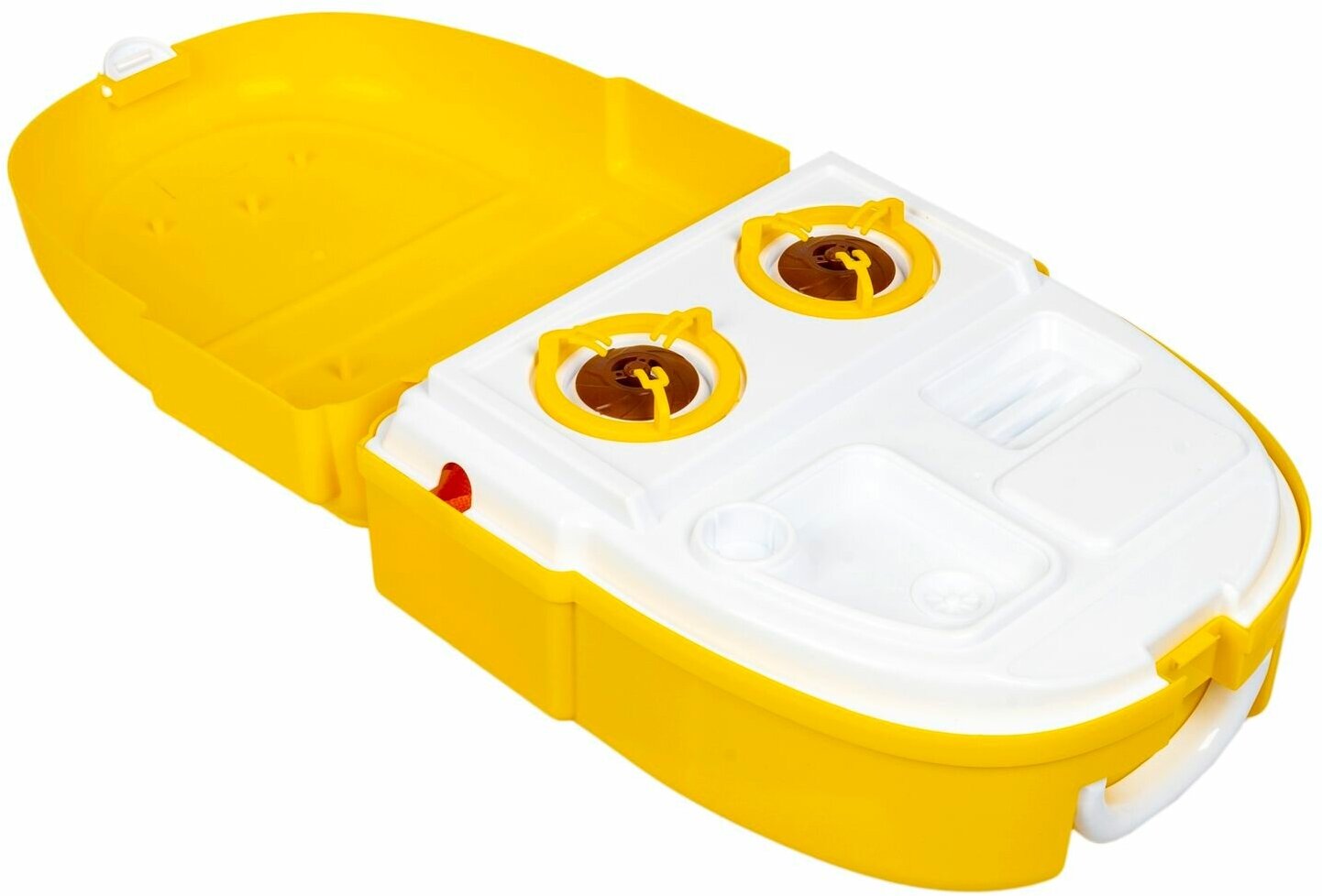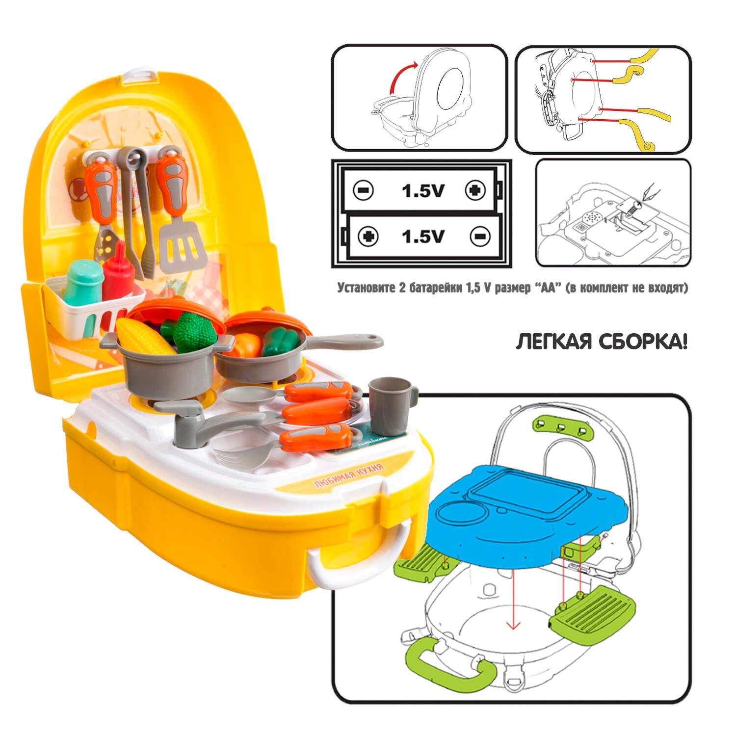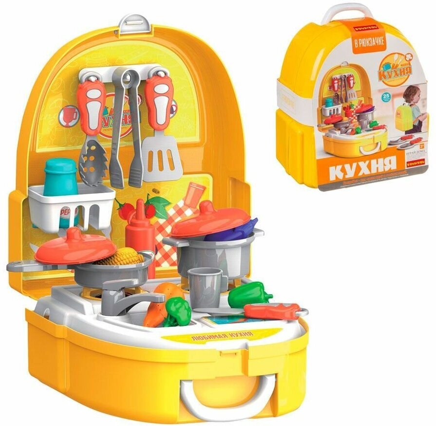 О! Это отличный игровой набор! Шикарная альтернатива нашей Маленькой Хозяюшке в играх с приготовлением блюд, и, совершенно, не уступающая большим кухонным гарнитурам. Всё очень компактно, качественно выполнено, всё абсолютно совпадает с картинкой на рюкзачке. Выбрала жёлтый чемоданчик для ДОЧЕНЬКИ, была уверена, что понравится, и не ошиблась! Для Девочек 2-х - 3-х лет - это удобно, не громоздко, не занимает много места, нам достаточно вполне разместить на детском игровом столике и ещё ставить дополнительную посуду. В набор входят: кастрюлька и сковородочка с крышкой, ложечка, вилочка, щипцы, овощи. Нам очень понравился рюкзачок, всё лето ДОЧЬ играет с удовольствием! Будете довольны, искренне советую!