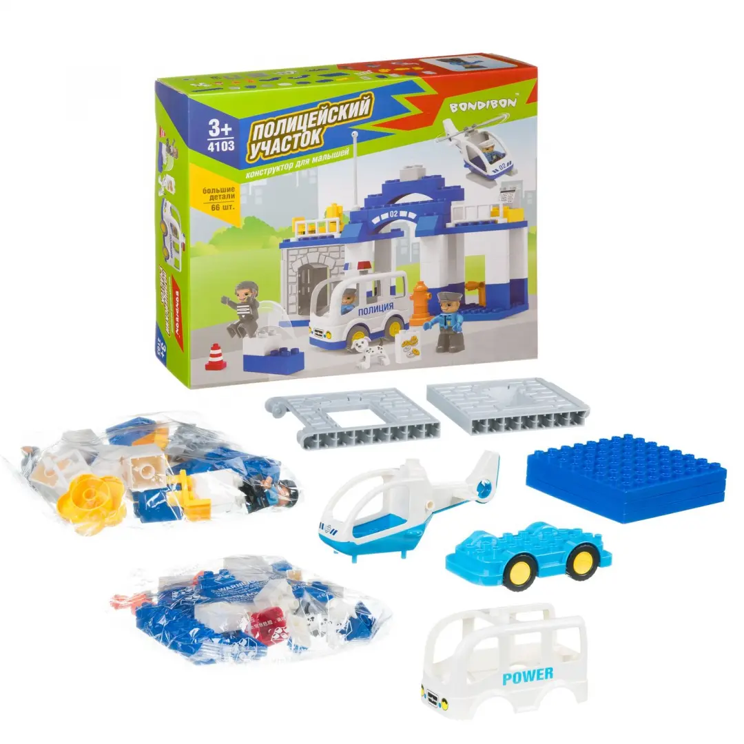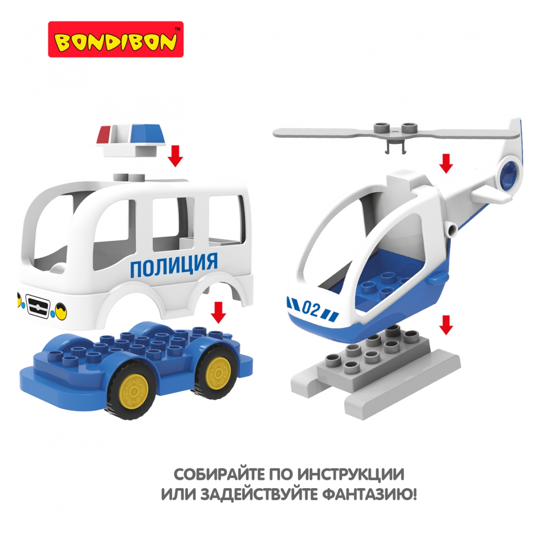 Ни для кого не секрет, что конструкторы являются одной из самых развивающих игрушек для детей. Многолетние исследования ученых доказали, что сборка конструкторов напрямую влияет на развитие математических способностей. Кроме того игра в конструкторы развивает моторику, логическое и пространственное мышление, способствует развитию воображения и творческого мышления. В состав набора Полицейский участок входит 66 деталей. Вертолёт, полицейская машина, фигурки весёлых полицейских и преступника, служебная собака - отличные помощники для создания своих детективных историй. Также в наборе есть наклейки для декорирования игровых блоков конструктора. Детали конструкторов ТМ Bondibon совместимы с деталями конструкторов мировых производителей.