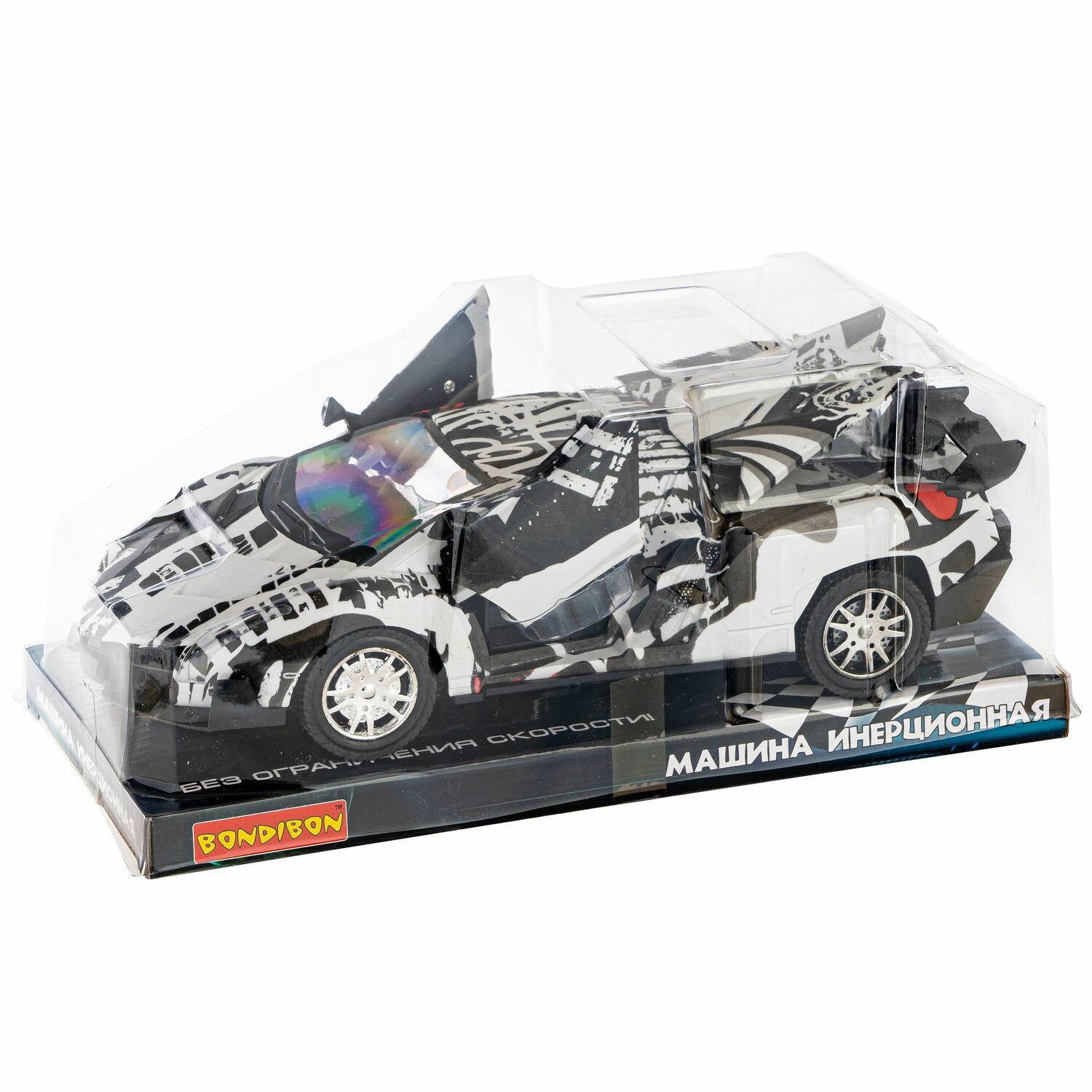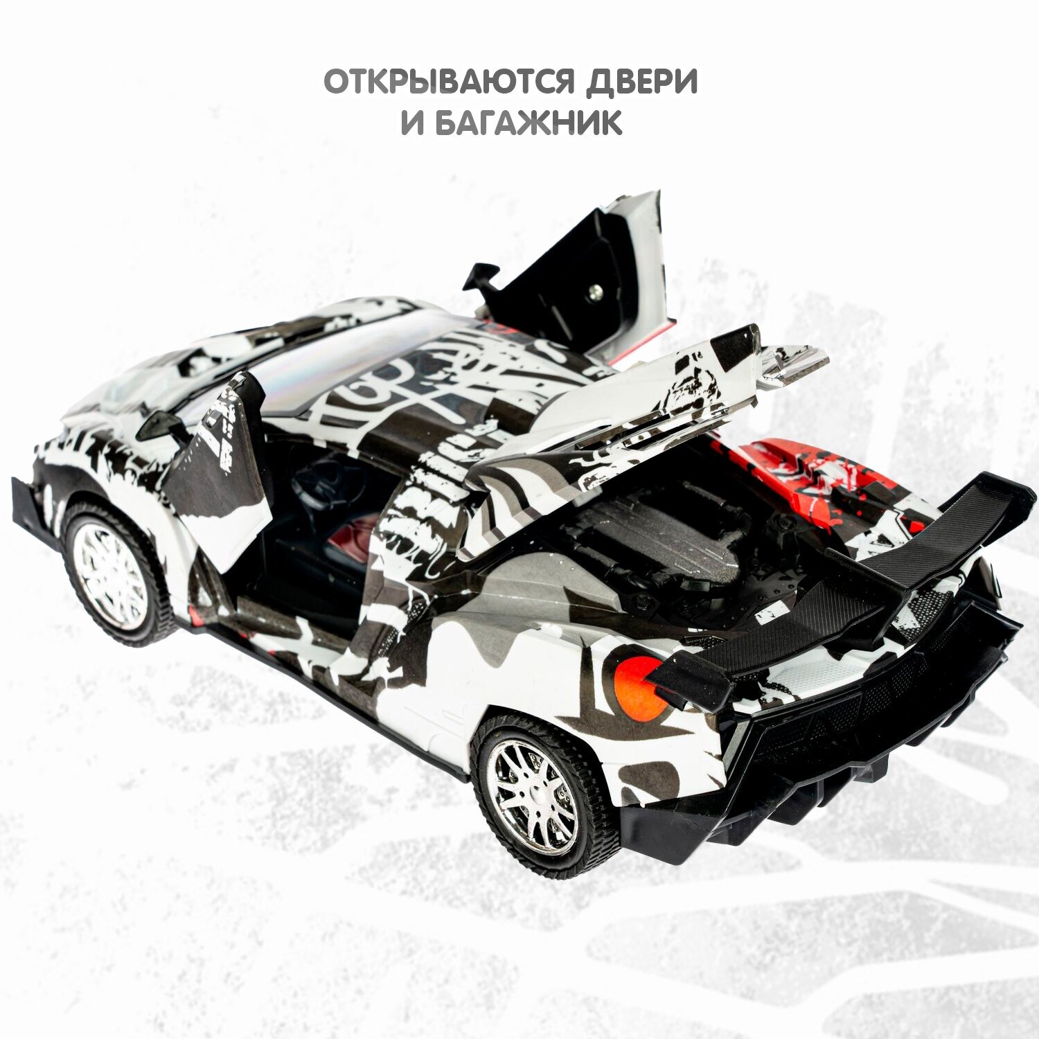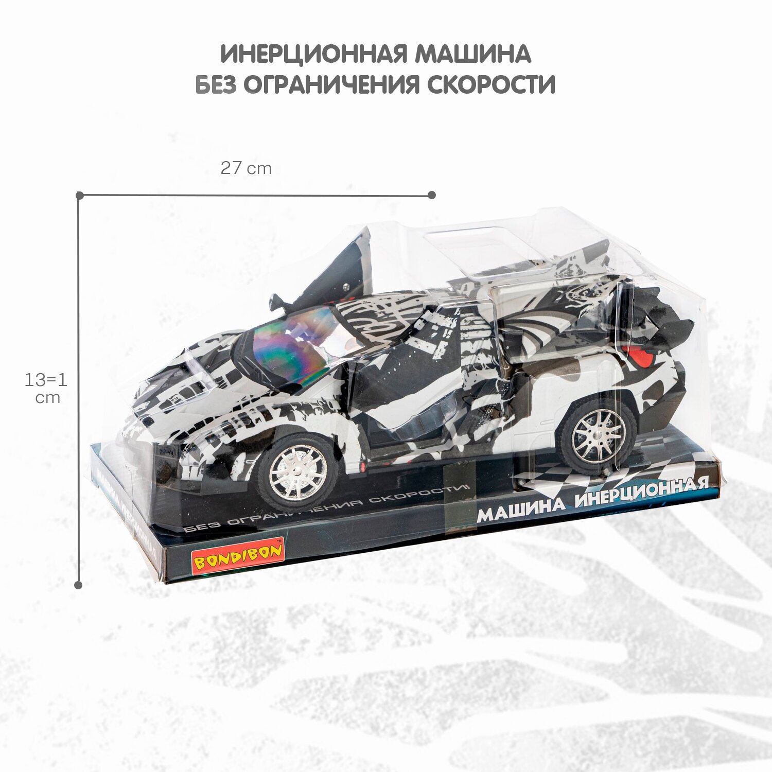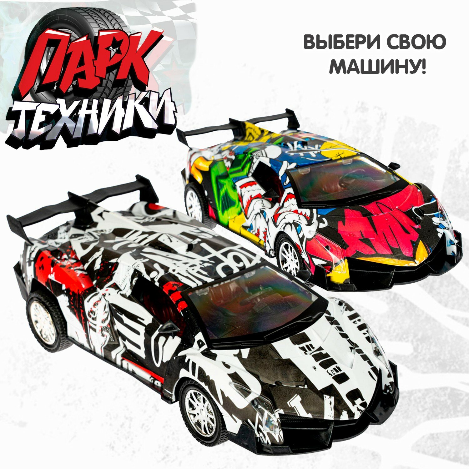 Черный, с бело-красными граффити, инерционный джип "Парк Техники" с открывающимися дверьми от ТМ Bondibon займет почетное место в гараже юного автолюбителя. Ведь с машинками можно придумать столько интересных игр!
