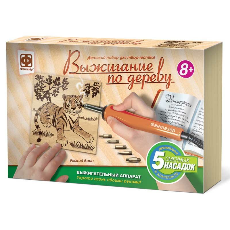 Теперь не нужно думать, как сделать линии более тонкими, где найти подходящий материал для будущей картины - все в этой коробке, Во-первых, это удобный современный выжигательный аппарат с 5 сменными насадками, чтобы вам было легче сотворить именно то, что вы задумали. Во-вторых, это два листа фанеры: один с уже нанесенным сюжетом будущего рисунка, а второй - чистый.