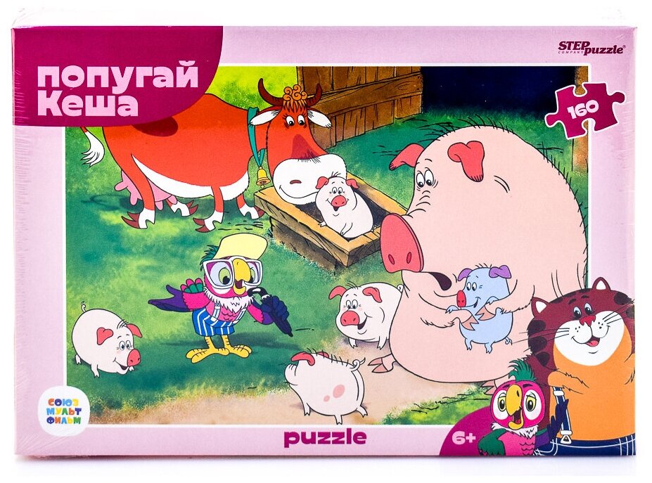Пазл "Попугай Кеша" состоит из 160 деталей. На картинке мы видим, как Кеша гуляет по деревне и показывает свои таланты животным, которые там обитают.