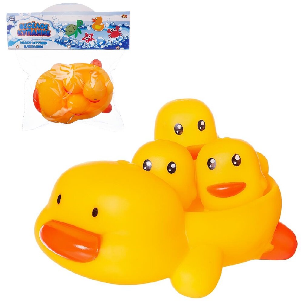 В набор входят четыре фигурки желтых утят: утка-мама и 3 ее утенка. Утята могут плавать самостоятельно, а могут удобно расположиться на спине у мамы.