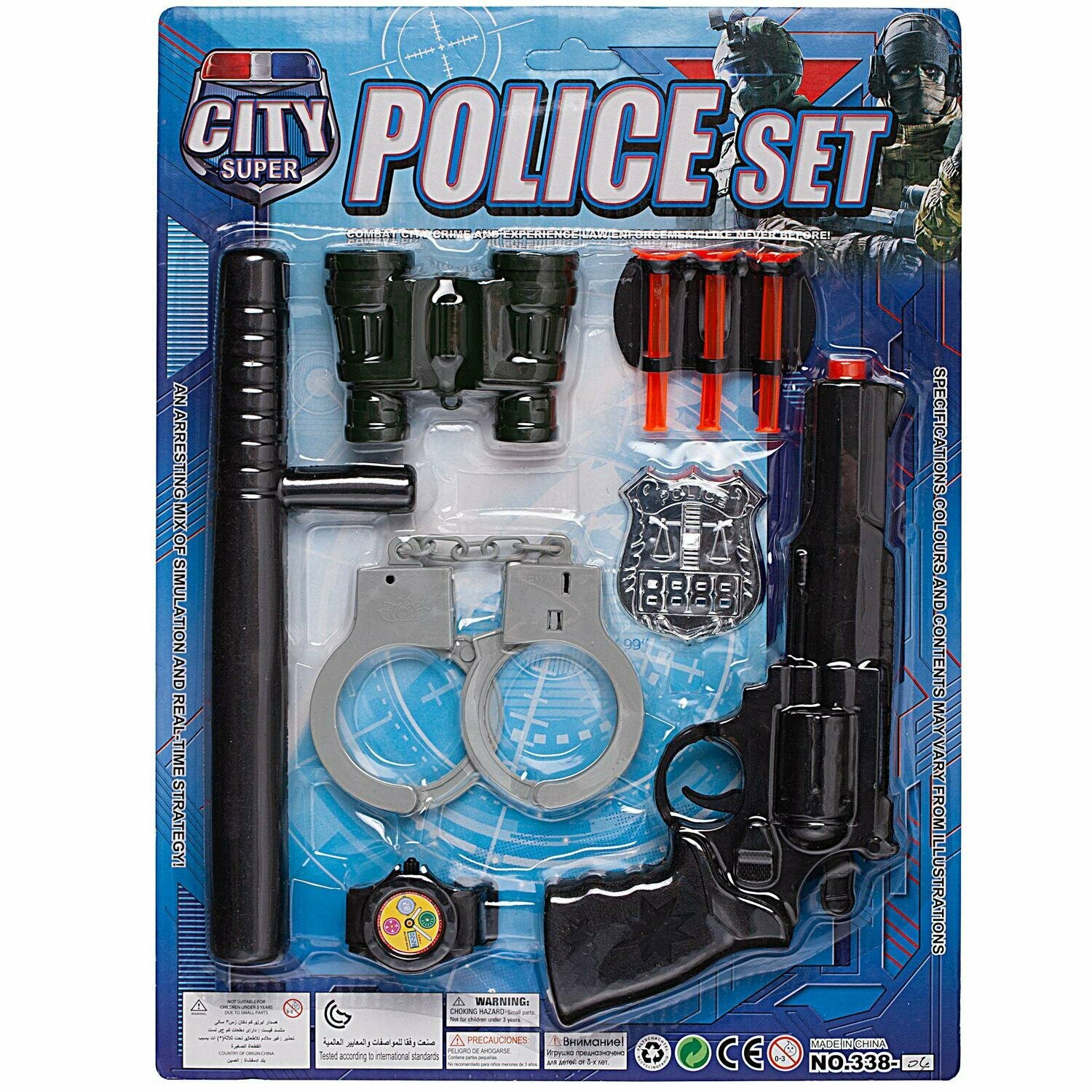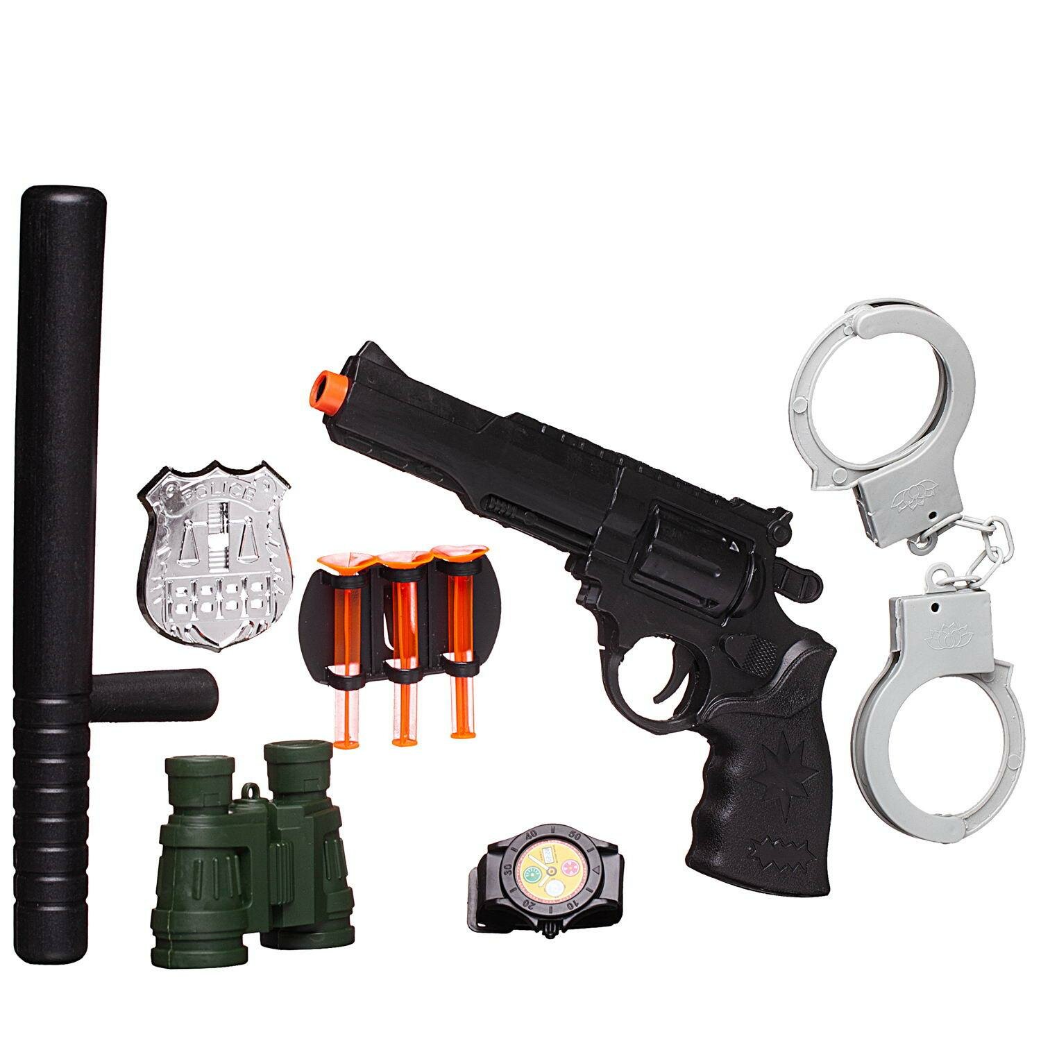 Малыш получит: большой пистолет, три стрелы с присосками на концах, держатель для них, наручники, дубинку, бинокль, часы и жетон полицейского.