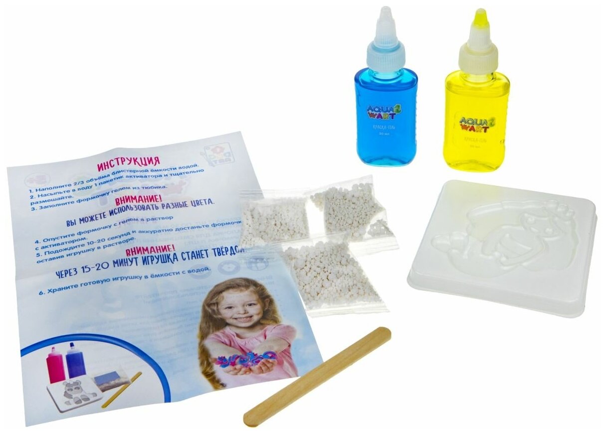 Наборы "AQUA ART" - это оригинальные наборы для создания фигурок из цветного геля. Нужно только заполнить гелем формочки, опустить их в водный раствор и игрушка готова! В каждый комплект входит формочка, два тюбика с краской-гелем, палочка и инструкция. Блистерная упаковка является ёмкостью для водного раствора. Набор развивает творческое мышление, воображение и мелкую моторику.