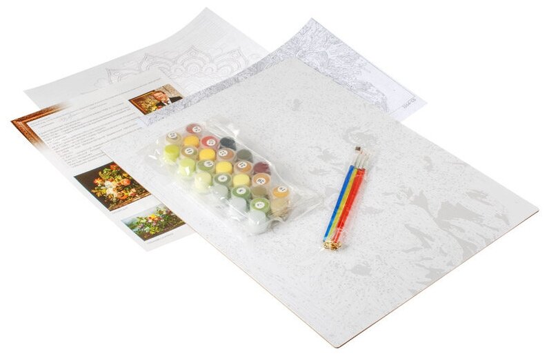 | Комплектация | Картонная основа, Акриловые краски, 4 кисти, Контрольный лист, Крепеж для подвешивания картины |