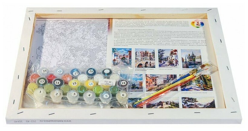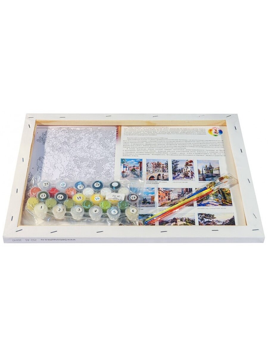 В комплекте набора холст, натянутый на деревянный подрамник, на холсте контурами обозначены области для раскрашивания, внутри областей цифрой отмечен номер необходимой краски. Также в комплект набора для раскрашивания входит контрольный лист, по которому вы всегда можете свериться в ходе работы. В наборе есть акриловые краски, расфасованные в маленькие баночки, на крышках которых приклеен номер краски. В набор также входят 4 кисточки для акриловых красок: тонкая для раскрашивания мелких деталей и контуров, и средняя для закрашивания больших участков картины. Готовую картину закрепите на стене с помощью настенного крепления - шурупчики, веревочка, пластмассовый крючок и крепеж на рамку уже есть в комплекте.